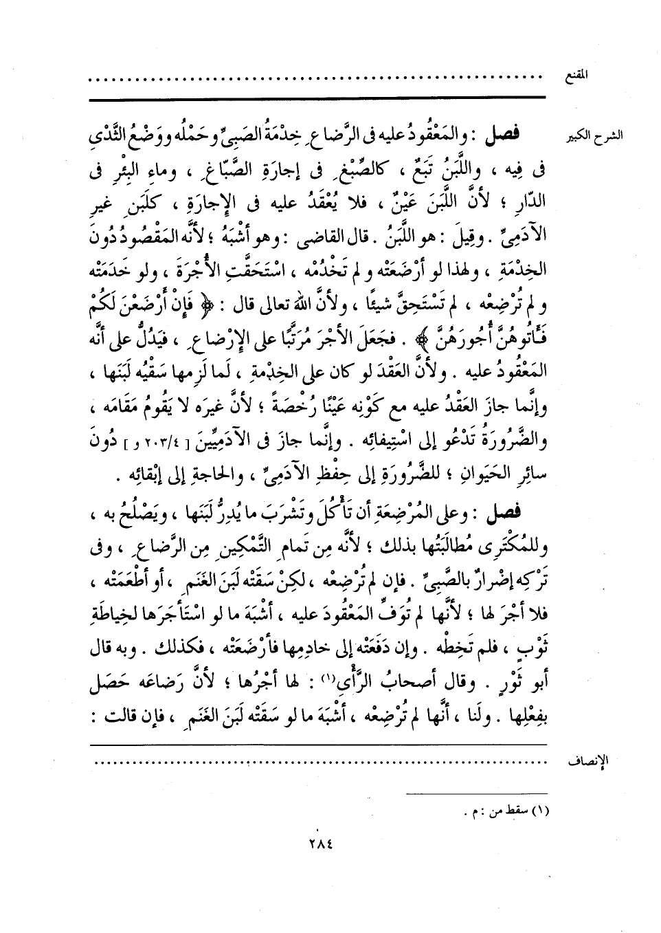 فصل: والمَعْقُودُ عليه في الرَّضاعِ خِدْمَةُ الصَبِيِّ وحَمْلُه ووَضْعُ الثَّدْيِ في فِيه، واللَّبَنُ تَبَعٌ، كالصِّبْغِ في إجارَةِ الصَّبّاغِ، وماءِ البِئْرِ في الدّارِ؛ لأنَّ اللَّبَنَ عَينٌ، فلا يُعْقَدُ عليه في الإِجارَةِ، كلَبَنِ غيرِ الآدَمِيِّ. وقِيلَ: هو اللَّبَنُ. قال القاضي: وهو أشْبَهُ؛ لأنَّه المَقْصُودُ دُونَ الخِدْمَةِ، ولهذا لو أرْضَعَتْه ولم تَخْدُمْه، اسْتَحَقَّتِ الأجْرَةَ، ولو خَدَمَتْه ولم تُرْضِعْه، لم تَسْتَحِقَّ شيئًا، ولأنَّ اللهَ تعالى قال: {فَإِنْ أَرْضَعْنَ لَكُمْ فَآتُوهُنَّ أُجُورَهُنَّ}. فجَعَلَ الأجْرَ مُرَتَّبًا على الإِرْضاعِ، فيَدُلُّ على أنَّه المَعْقُودُ عليه. ولأنَّ العَقْدَ لو كان على الخِدْمةِ، لَما لَزِمها سَقْيُه لَبَنَها، وإنَّما جازَ العَقْدُ عليه مع كَوْنِه عَينًا رُخْصَةً؛ لأنَّ غيرَه لا يَقُومُ مَقَامَه، والضَّرُورَةُ تَدْعُو إلى اسْتِيفائِه. وإنَّما جازَ في الآدَمِيِّينَ دُونَ سائِرِ الحَيَوانِ؛ للضَّرُورَةِ إلى حِفْظِ الآدَمِيِّ، والحاجةِ إلى إبْقائِه.
