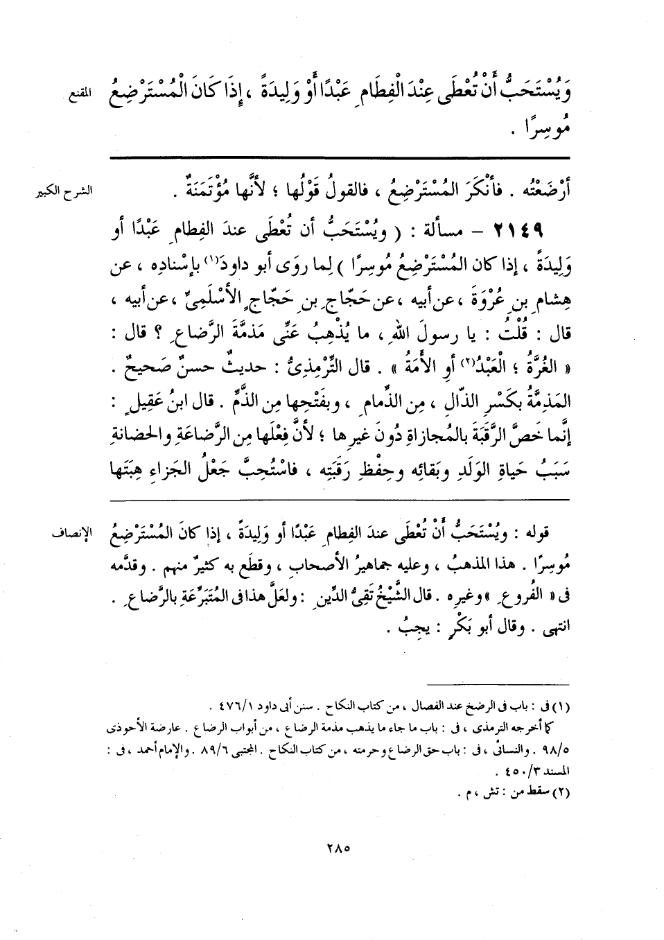 قوله: ويُسْتَحَبُّ أنْ تُعْطَى عندَ الفِطامِ عَبْدًا أو وَلِيدَةً، إذا كانَ المُسْتَرْضِعُ مُوسِرًا. هذا المذهبُ، وعليه جماهيرُ الأصحابِ، وقطَع به كثير منهم. وقدَّمه في «الفُروعِ» وغيرِه. قال الشَّيخُ تَقِيُّ الدِّينِ: ولعَلَّ هذا في المُتَبَرِّعَةِ بالرَّضاعِ. انتهى. وقال أبو بَكْر: يجِبُ.