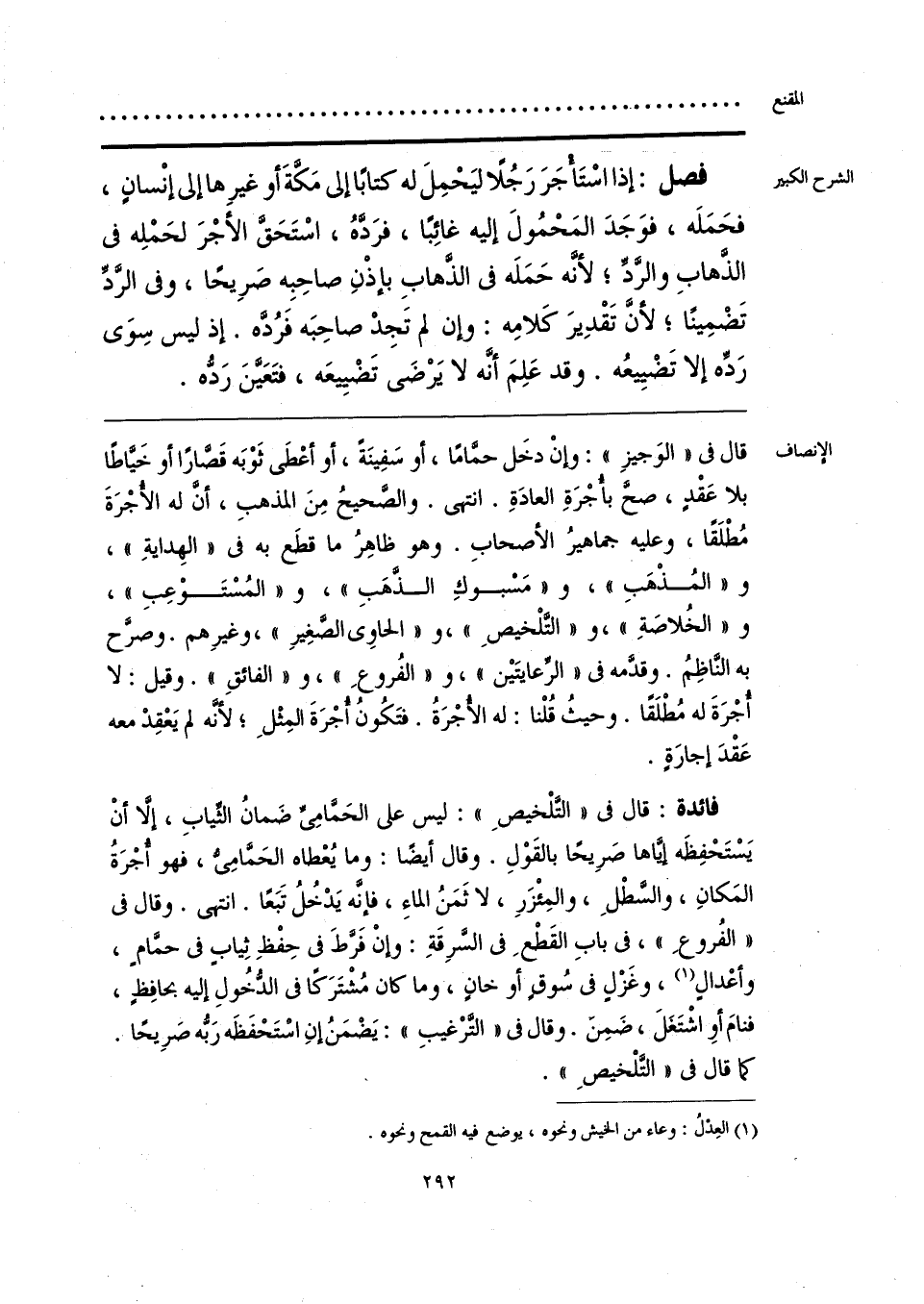 فائدة: قال في «التلْخيصِ»: ليس على الحَمَّامِيِّ ضَمانُ الثيابِ، إلَّا أنْ يَسْتَحْفِظَه إياها صَرِيحًا بالقَوْلِ. وقال أيضًا: وما يُعْطاه الحَمَّامِي، فهو أُجْرَةُ المَكانِ، والسَّطْلِ، والمِئْزَرِ، لا ثَمَنُ الماءِ، فإنَّه يَدْخُلُ تَبَعًا. انتهى. وقال في «الفُروعِ»، في بابِ القَطْعِ في السَّرِقَةِ: وإنْ فَرَّطَ في حِفْظِ ثِيابٍ في حمَّام، وأعْدالٍ (¬1)، وغَزْلٍ في سُوقٍ أو خانٍ، وما كان مُشْتَرَكًا في الدُّخُولِ إليه بحافِظٍ، فنامَ أو اشْتَغلَ، ضَمِن. وقال في «التَّرْغيبِ»: يَضْمَنُ إنِ استَحْفَظَه ربُّه صَرِيحًا. كما قال في «التَّلْخيص».