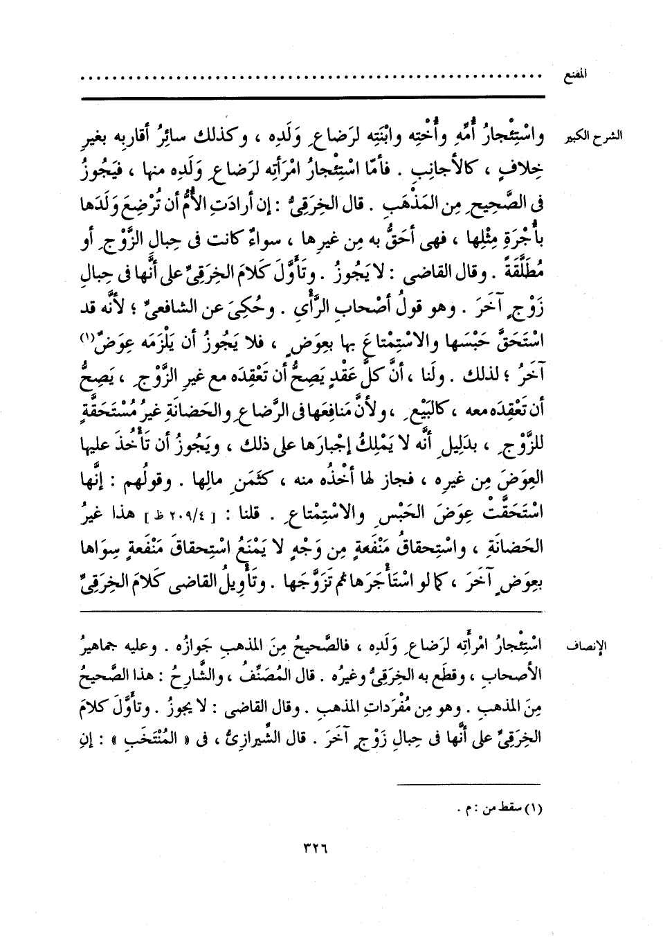 اسِتئجارُ امْرأته لرَضاعِ وَلَدِه، فالصَّحيحُ مِنَ المذهبِ جَوازُه. وعليه جماهيرُ الأصحابِ، وقطَع به الخِرَقِيُّ وغيرُه. قال المُصَنِّفُ، والشَّارِحُ: هذا الصَّحيحُ مِنَ المذهبِ. وهو مِن مُفْرَداتِ المذهبِ. وقال القاضي: لا يجوزُ. وتأوَّلَ كلامَ الخِرَقِيِّ على أنها في حِبالِ زَوْجٍ آخَرَ. قال الشِّيرازِي، في «المُنْتَخَبِ»: إنِ