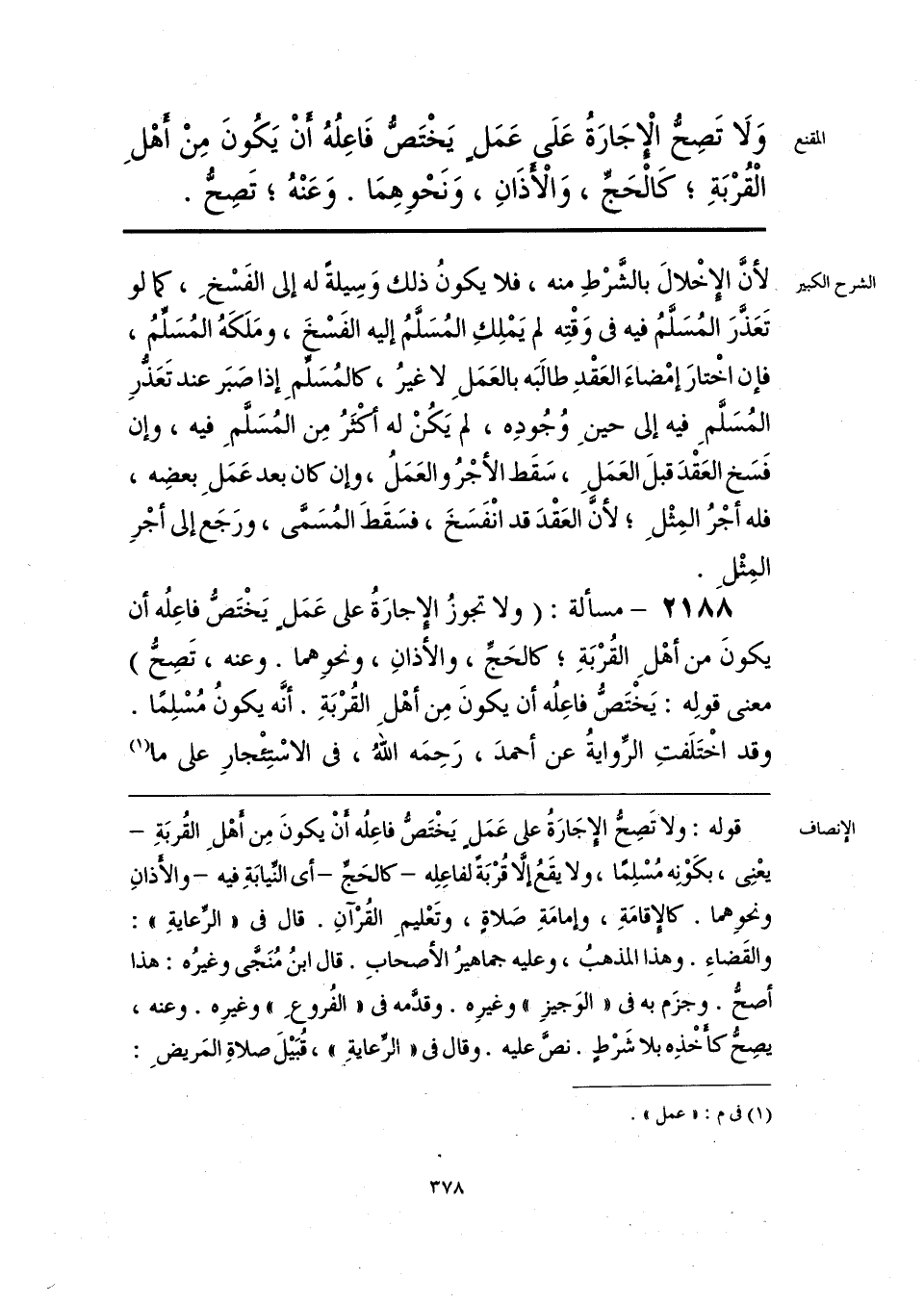 قوله: ولا تَصِحُّ الإِجَارَةُ على عَمَلٍ يَخْتَصُّ فاعِلُه أَنْ يكونَ مِن أَهْلِ القُربَةِ -يعْنِي، بكَوْنِه مُسْلِمًا، ولا يقَعُ إلَّا قُرْبَةً لفاعِلِه- كالحَجِّ -أي النِّيابَةِ فيه- والأَذانِ ونحوهما. كالإِقامَةِ، وإمامَةِ صَلاةٍ، وتَعْليمِ القُرْآنِ. قال في «الرِّعايةِ»: والقَضاءِ. وهذا المذهبُ، وعليه جماهيرُ الأصحابِ. قال ابنُ مُنَجَّى وغيرُه: هذا أصحُّ. وجزَم به في «الوَجيزِ» وغيرِه. وقدَّمه في «الفُروعِ» وغيرِه. وعنه، يصِحُّ كأَخْذِه بلا شَرْطٍ. نصَّ عليه. وقال في «الرِّعايةِ»، قُبَيلَ صلاةِ المَريضِ: