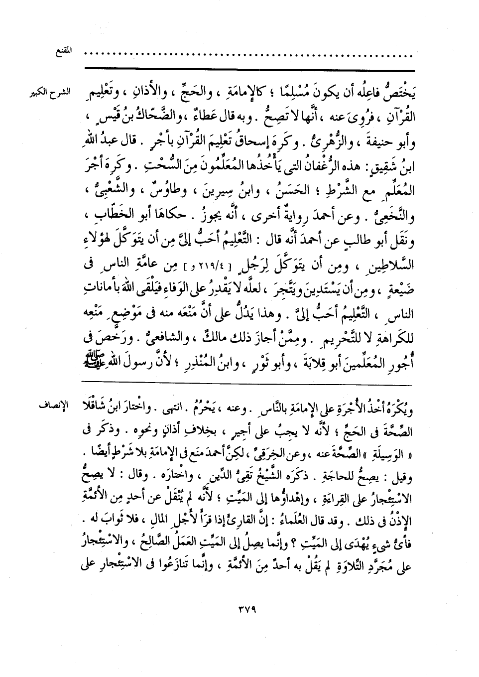 ويُكْرَهُ أخْذُ الأُجْرَةِ على الإِمامَةِ بالنَّاسِ. وعنه، يَحْرُمُ. انتهى. واخْتارَ ابنُ شَاقْلَا الصِّحَّةَ في الحَجِّ؛ لأنَّه لا يجِبُ على أجِيرٍ، بخِلافِ أذانٍ ونحوه. وذكَر في «الوَسِيلَةِ» الصِّحَّةَ عنه، وعن الخِرَقِيِّ، لكِنَّ أحمدَ منَع في الإِمامَةِ بلا شَرْطٍ أيضًا. وقيل: يصِحُّ للحاجَةِ. ذكَرَه الشَّيخُ تَقِيُّ الدِّينِ، واخْتارَه. وقال: لا يصِحُّ الاسْتِئْجارُ على القِراءَةِ، وإهْداؤُها إلى المَيِّتِ؛ لأنَّه لم يُنْقَلْ عن أحدٍ مِن الأئمَّةِ الإِذْنُ في ذلك. وقد قال العُلَماءُ: إنَّ القارِئَ إذا قرَأَ لأَجْلِ المالِ، فلا ثَوابَ له. فأيُّ شيءٍ يُهْدَى إلى المَيِّتِ؟ وإنَّما يصِلُ إلى المَيِّتِ العَمَلُ الصَّالِحُ، والاسْتِئْجارُ على مُجَرَّدِ التِّلاوَةِ لم يَقُلْ به أحدٌ مِنَ الأئمَّةِ، وإنَّما تَنازَعُوا في الاسْتِئْجارِ على