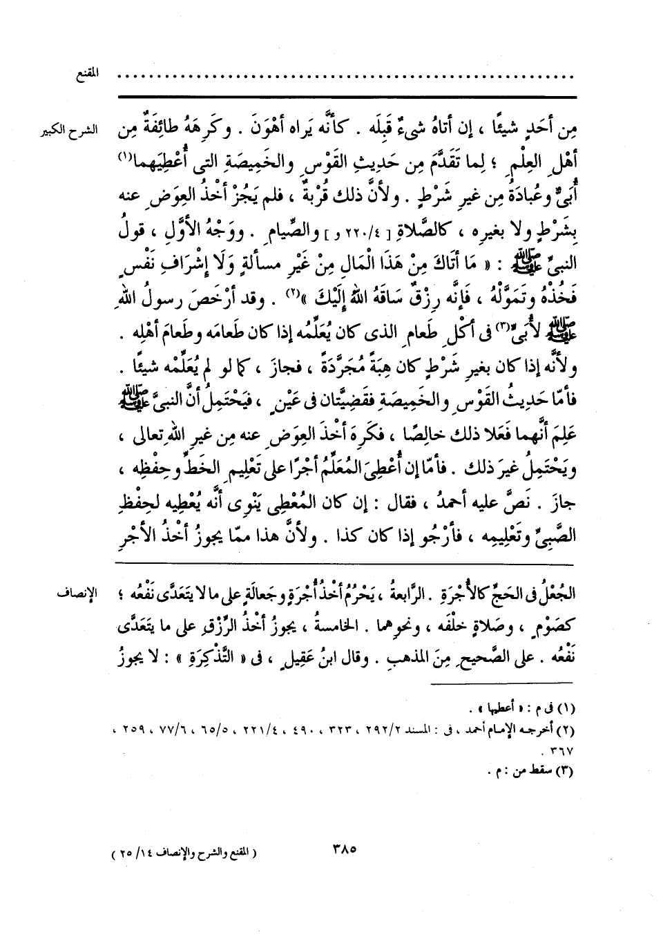 الجُعْلُ في الحَجِّ كالأُجْرَةِ. الرَّابعةُ، يَحْرُمُ أخْذُ أُجْرَةٍ وجَعالةٍ على ما لا يتَعَدَّى نَفْعُه؛ كصَوْمٍ، وصَلاةٍ خلْفَه، ونحوهما. الخامسةُ، يجوزُ أخْذُ الرِّزْقِ على ما يتَعَدَّى نَفْعُه. على الصَّحيحِ مِنَ المذهبِ. وقال ابنُ عَقِيلٍ، في «التَّذْكِرَةِ»: لا يجوزُ