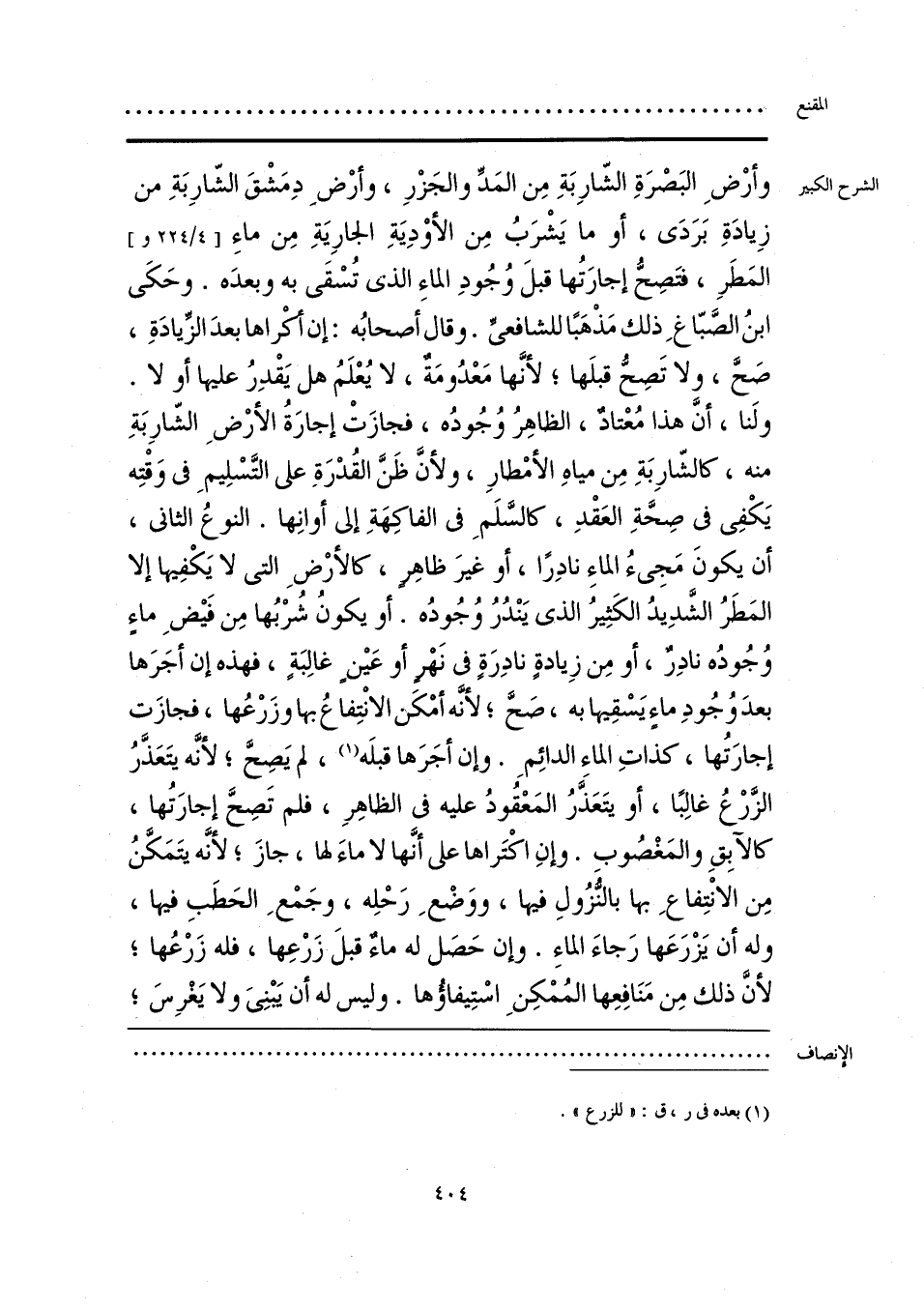 وأرْضِ البَصْرَةِ الشّارِبَةِ مِن المَدِّ والجَزْرِ، وأرْضِ دِمَشْقَ الشّارِبَةِ من زِيادَةِ بَرَدَى، أو ما يَشْرَبُ مِن الأوْدِيَةِ الجارِيَةِ مِن ماءِ المَطَرِ، فتَصِحُّ إجارَتُها قبلَ وُجُودِ الماءِ الذي تُسْقَى به وبعدَه. وحَكَى ابنُ الصَّبّاغِ ذلك مَذْهَبًا للشافعيِّ. وقال أصحابُه: إن أكْراها بعدَ الزِّيادَةِ، صَحَّ، ولا تَصِحُّ قبلَها؛ لأنَّها مَعْدُومَةٌ، لا يُعْلَمُ هل يَقْدِرُ عليها أو لا. ولَنا، أنَّ هذا مُعْتادٌ، الظاهِرُ وُجُودُه، فجازَتْ إجارَةُ الأرْضِ الشّارِبَةِ منه، كالشّارِبَةِ مِن مياهِ الأمْطارِ، ولأنَّ ظَنَّ القُدْرَةِ على التَّسْلِيمِ في وَقْتِه يَكْفِي في صِحَّةِ العَقْدِ، كالسَّلَمِ في الفاكِهَةِ إلى أوانِها. النوعُ الثاني، أن يكونَ مَجِئُ الماءِ نادِرًا، أو غيرَ ظاهِرٍ، كالأرْضِ التي لا يَكْفِيها إلا المَطَرُ الشَّدِيدُ الكَثِيرُ الذي يَنْدُرُ وُجُودُه. أو يكونُ شُرْبُها مِن فَيضِ ماءٍ وُجُودُه نادِرٌ، أو مِن زِيادةٍ نادِرَةٍ في نَهْرٍ أو عَينٍ غالِبَةٍ، فهذه إن أجَرَها بعدَ وُجُودِ ماءٍ يَسْقِيها به، صَحَّ؛ لأنَّه أمْكَن الانْتِفاعُ بها وزَرْعُها، فجازَت إجارَتُها، كذاتِ الماءِ الدائِمِ. وإن أجَرَها قبلَه (¬1)، لم يَصِحَّ؛ لأنَّه يتَعَذَّرُ الزَّرْعُ غالِبًا، أو يتَعَذَّرُ المَعْقُودُ عليه في الظاهِرِ، فلم تَصِحَّ إجارَتُها، كالآبِقِ والمَغْصُوب. وإنِ اكْتَراها على أنَّها لا ماءَ لها، جازَ؛ لأنَّه يتَمَكَّنُ مِن الانْتِفاعِ بها بالنُّزُولِ فيها، ووَضْعِ رَحْلِه، وجَمْعِ الحَطَبِ فيها، وله أن يَزْرَعَها رَجاءَ الماءِ. وإن حَصَل له ماءٌ قبلَ زَرْعِها، فله زَرْعُها؛ لأنَّ ذلك مِن مَنَافِعِها المُمْكِنِ اسْتِيفاؤُها. وليس له أن يَبْنِيَ ولا يَغْرِسَ؛