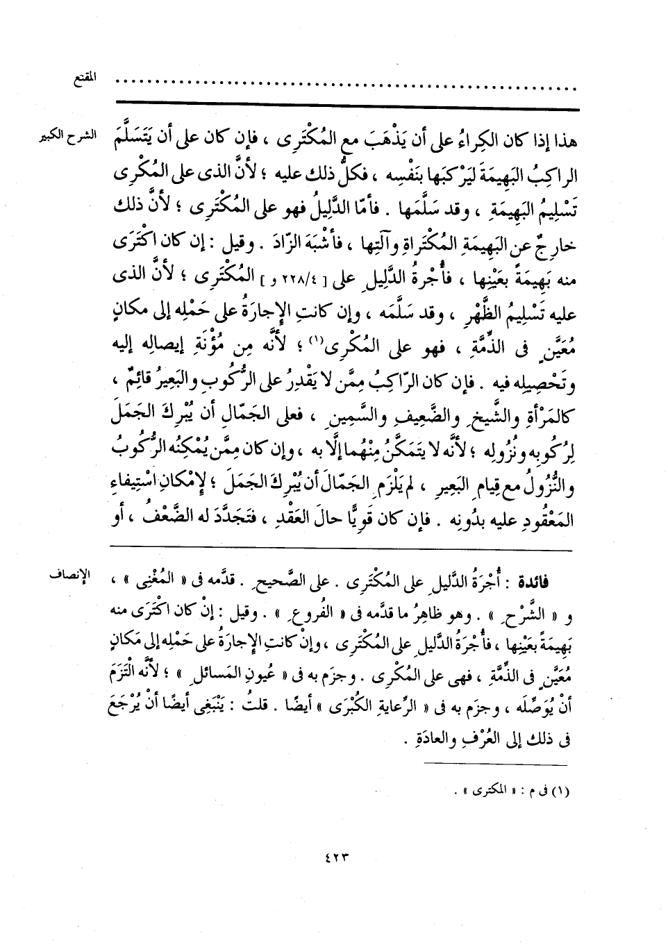 فائدة: أُجْرَةُ الدَّليلِ على المُكْتَرِي. على الصَّحيحِ. قدَّمه في «المُغْنِي»، و «الشَّرْحِ». وهو ظاهِرُ ما قدَّمه في «الفُروعِ». وقيل: إنْ كان اكْتَرَى منه بَهِيمَةً بعَينِها، فأُجْرَةُ الدَّليلِ على المُكْتَرِي، وإنْ كانتِ الإِجارَةُ على حَمْلِه إلى مَكانٍ مُعَيَّنٍ في الذِّمَّةِ، فهي على المُكْرِي. وجزَم به في «عُيونِ المَسائلِ»؛ لأنَّه الْتَزَمَ أنْ يُوَصِّلَه، وجزَم به في «الرِّعايةِ الكُبْرَى» أيضًا. قلتُ: يَنْبَغِي أيضًا أنْ يُرْجَعَ في ذلك إلى العُرْفِ والعادَةِ.