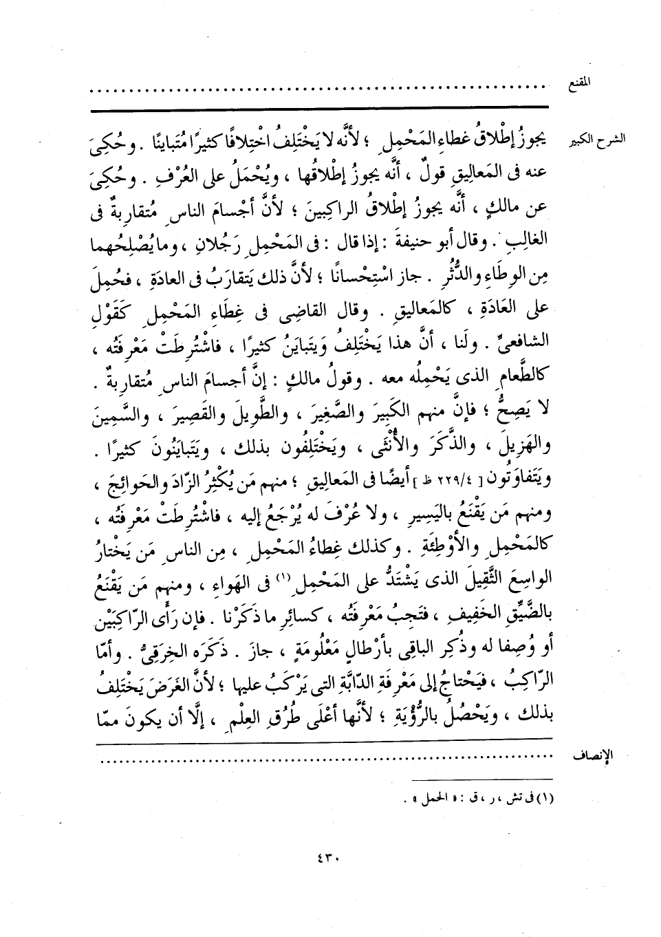يجوزُ إطْلاقُ غطاءِ المَحْمِلِ؛ لأنَّه لا يَخْتَلِفُ اخْتِلافًا كثيرًا مُتَباينًا. وحُكِيَ عنه في المَعالِيقِ قولٌ، أنَّه يجوزُ إطْلاقُها، ويُحْمَلُ على العُرْفِ. وحُكِيَ عن مالكٍ، أنَّه يجوزُ إطْلاقُ الراكِبينَ؛ لأنَّ أجْسامَ الناسِ مُتقارِبةٌ في الغالِبِ. وقال أبو حنيفةَ: إذا قال: في المَحْمِلِ رَجُلانِ، وما يُصْلِحُهما مِن الوطَاءِ والدُّثُرِ. جاز اسْتِحْسانًا؛ لأنَّ ذلك يَتقارَبُ في العادَةِ، فحُمِلَ على العَادَةِ، كالمَعاليقِ. وقال القاضِي في غِطَاءِ المَحْمِلِ كَقَوْلِ الشافعيِّ. ولَنا، أنَّ هذا يَخْتَلِفُ وَيتَبايَنُ كثيرًا، فاشْتُرِطَتْ مَعْرِفَتُه، كالطَّعامِ الذي يَحْمِلُه معه. وقولُ مالكٍ: إنَّ أجسامَ الناسِ مُتقارِبةٌ. لا يَصِحُّ؛ فإنَّ منهم الكَبِيرَ والصَّغِيرَ، والطَّويلَ والقَصِيرَ، والسَّمِينَ والهَزِيلَ، والذَّكَرَ والأُنْثَى، ويَخْتَلِفُون بذلك، ويَتَبايَنُونَ كثيرًا. ويَتَفاوَتُون أيضًا في المَعالِيقِ؛ منهم مَن يُكْثِرُ الزّادَ والحَوائِجَ، ومنهم مَن يَقْنَعُ باليَسِيرِ، ولا عُرْفَ له يُرْجَعُ إليه، فاشْتُرِطَتْ مَعْرِفَتُه، كالمَحْمِلِ والأوْطِئَةِ. وكذلك غِطاءُ المَحْمِلِ، مِن الناسِ مَن يَخْتارُ الواسِعَ الثَّقِيلَ الذي يَشْتَدُّ على المَحْمِلِ (¬1) في الهَواءِ، ومنهم مَن يَقْنَعُ بالضَّيِّقِ الخَفِيفِ، فتَجِبُ مَعْرِفَتُه، كسائِرِ ما ذَكَرْنا. فإن رَأَى الرّاكِبَين أو وُصِفا له وذُكِر الباقِي بأرْطالٍ مَعْلُومَةٍ، جازَ. ذَكَرَه الخِرَقِيُّ. وأمَّا الرّاكِبُ، فيَحْتاجُ إلى مَعْرِفَةِ الدّابَّةِ التي يَرْكَبُ عليها؛ لأنَّ الغَرَضَ يَخْتَلِفُ بذلك، ويَحْصُلُ بالرُّؤْيَةِ؛ لأنَّها أعْلَى طُرُقِ العِلْمِ، إلَّا أن يكونَ ممَّا