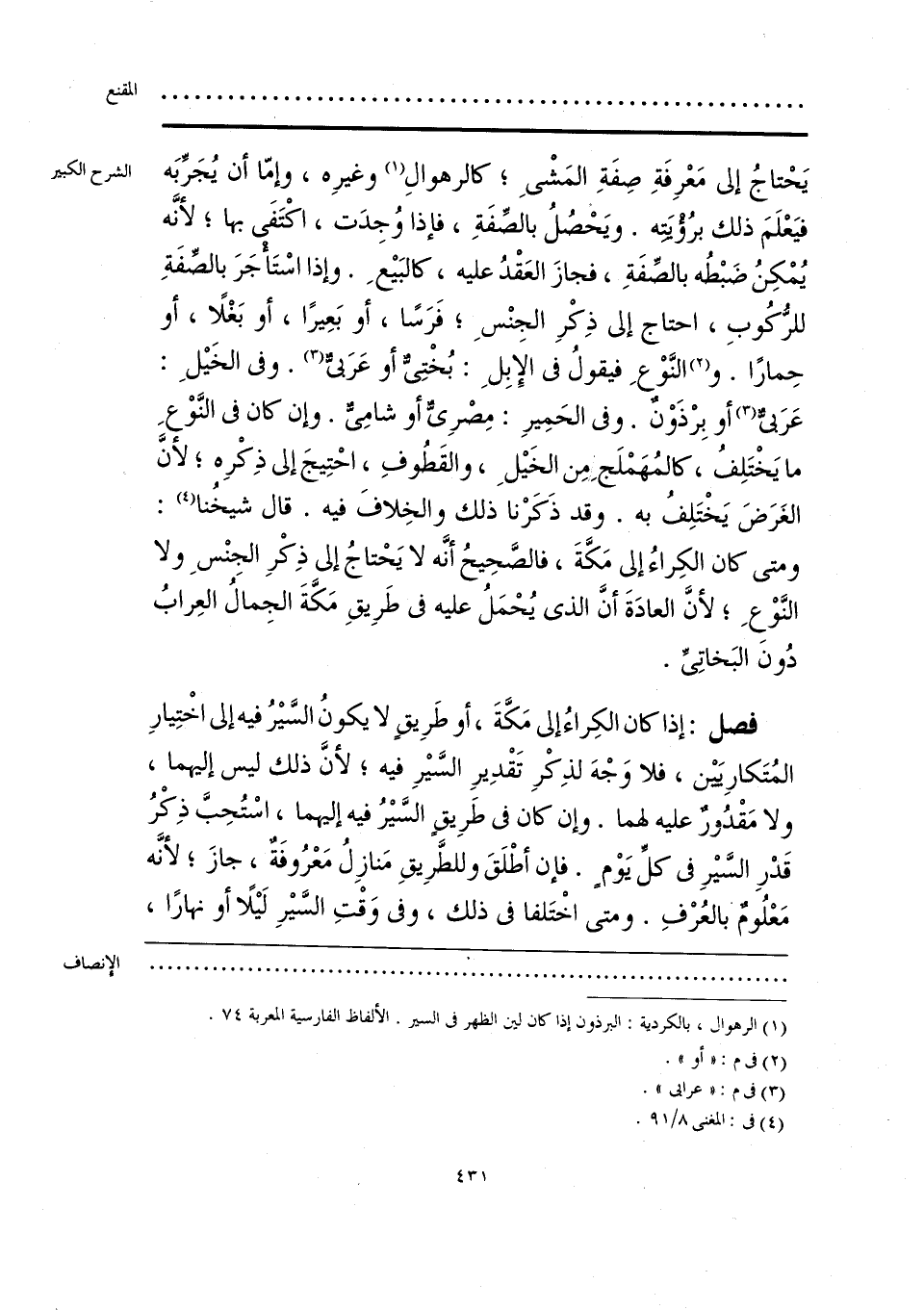يَحْتاجُ إلى مَعْرِفَةِ صِفَةِ المَشْي؛ كالرهوالِ (¬1) وغيرِه، وإمّا أن يُجَرِّبَه فيَعْلَمَ ذلك برُؤْيَتِه. ويَحْصُلُ بالصِّفَةِ، فإذا وُجِدَت، اكْتَفَى بها؛ لأنَّه يُمْكِنُ ضَبْطُه بالصِّفَةِ، فجازَ العَقْدُ عليه، كالبَيعِ. وإذا اسْتَأْجَرَ بالصِّفَةِ للرُّكُوبِ، احتاج إلى ذِكْرِ الجِنْسِ؛ فَرَسًا، أو بَعِيرًا، أو بَغْلًا، أو حِمارًا. و (¬2) النَّوْعِ فيقولُ في الإِبِلِ: بُخْتِيٌّ أو عَرَبيٌّ (¬3). وفي الخَيلِ: عَرَبيٌّ (3) أو بِرْذَوْنٌ. وفي الحَمِيرِ: مِصْرِيٌّ أو شامِيٌّ. وإن كان في النَّوْعِ ما يَخْتَلِفُ، كالمُهَمْلَج مِن الخَيلِ، والقَطُوفِ، احْتِيجَ إلى ذِكْرِه؛ لأنَّ الغَرَضَ يَخْتَلِفُ به. وقد ذَكَرْنا ذلك والخِلافَ فيه. قال شيخُنا (¬4): ومتى كان الكِراءُ إلى مَكَّةَ، فالصَّحِيحُ أنَّه لا يَحْتاجُ إلى ذِكْرِ الجِنْسِ ولا النَّوْعِ؛ لأنَّ العادَةَ أنَّ الذي يُحْمَلُ عليه في طَرِيقِ مَكَّةَ الجِمالُ العِرابُ دُونَ البَخاتِيِّ.