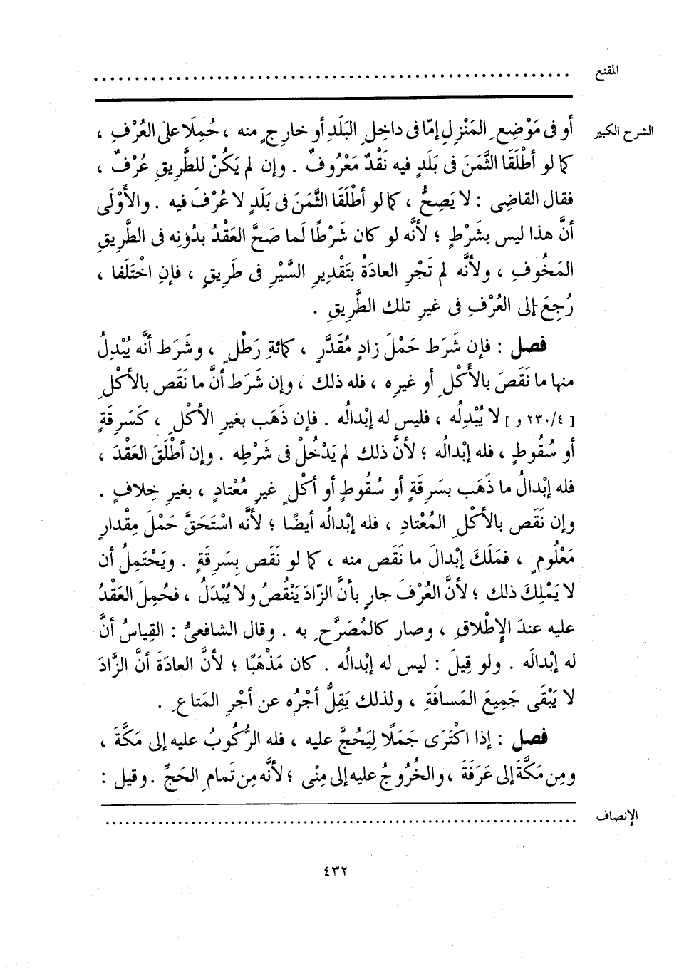 فصل: فإن شَرَط حَمْلَ زادٍ مُقَدَّرٍ، كمائةِ رَطْلٍ، وشَرَط أنَّه يُبْدِلُ منها ما نَقَصَ بالأَكْلِ أو غيرِه، فله ذلك، وإن شَرَط أنَّ ما نَقَص بالأكْلِ لا يُبْدِلُه، فليس له إبْدالُه. فإن ذَهَب بغيرِ الأكْلِ، كَسَرِقَةٍ أو سُقُوطٍ، فله إبْدالُه؛ لأنَّ ذلك لم يَدْخُلْ في شَرْطِه. وإن أطْلَقَ العَقْدَ، فله إبْدالُ ما ذَهَب بسَرِقَةٍ أو سُقُوطٍ أو أكْلٍ غيرِ مُعْتادٍ، بغيرِ خِلافٍ. وإن نَقَص بالأكْلِ المُعْتادِ، فله إبْدالُه أيضًا؛ لأنَّه اسْتَحَقَّ حَمْلَ مِقْدارٍ مَعْلُومٍ، فمَلَكَ إبْدال ما نَقَص منه،؛ لو نَقَص بِسَرِقَةٍ. ويَحْتَمِلُ أن لا يَمْلِكَ ذلك؛ لأنَّ العُرْفَ جارٍ بأنَّ الزّادَ يَنْقُصُ ولا يُبْدَلُ، فحُمِلَ العَقْدُ عليه عندَ الإِطْلاقِ، وصار كالمُصَرَّحِ به. وقال الشافعيُّ: القِياسُ أنَّ له إبْداله. ولو قِيلَ: ليس له إبْدالُه. كان مَذْهَبًا؛ لأنَّ العادَةَ أنَّ الزَّادَ لا يَبْقَى جَمِيعَ المَسافَةِ، ولذلك يَقِلُّ أجْبرُه عن أجْرِ المَتاعِ.