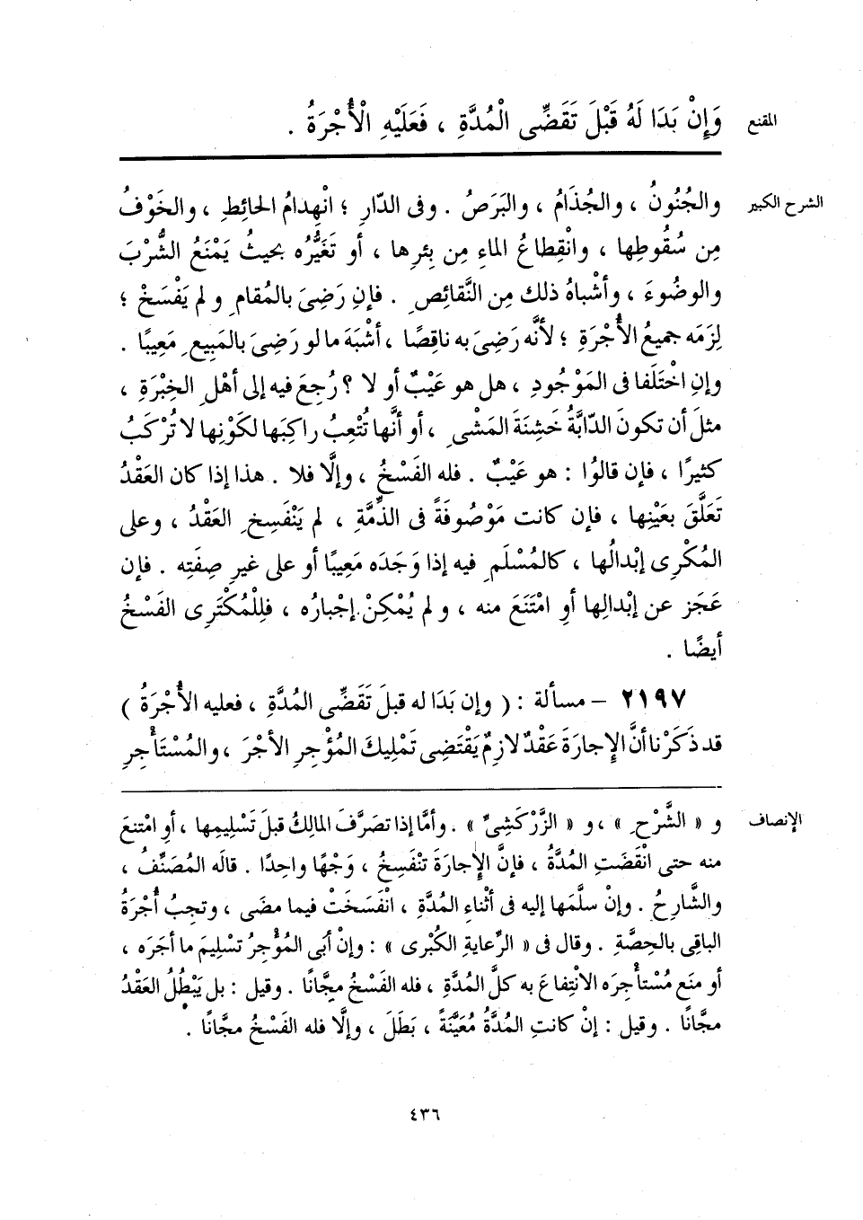 و «الشَّرْحِ»، و «الزَّرْكَشِيِّ». وأمَّا إذا تصَرَّفَ المالِكُ قبلَ تَسْلِيمِها، أو امْتنعَ منه حتى انْقَضَتِ المُدَّةُ، فإنَّ الإِجارَةَ تنْفَسِخُ، وَجْهًا واحِدًا. قاله المُصَنفُ، والشَّارِحُ. وإنْ سلَّمَها إليه في أثْناءِ المُدَّةِ، انْفَسَخَتْ فيما مضَى، وتجِبُ أُجْرَةُ الباقِي بالحِصَّةِ. وقال في «الرِّعايةِ الكُبْرى»: وإنْ أبَى المُؤْجِرُ تسْلِيمَ ما أجَرَه، أو منَع مُسْتأْجِرَه الانْتِفاعَ به كلَّ المُدِّةِ، فله الفَسْخُ مجِّانًا. وقيل: بل يَبْطُلُ العَقْدُ مجَّانًا. وقيل: إنْ كانتِ المُدة مُعَينَّةً، بَطَلَ، وإلَّا فله الفَسْخُ مجَّانًا.