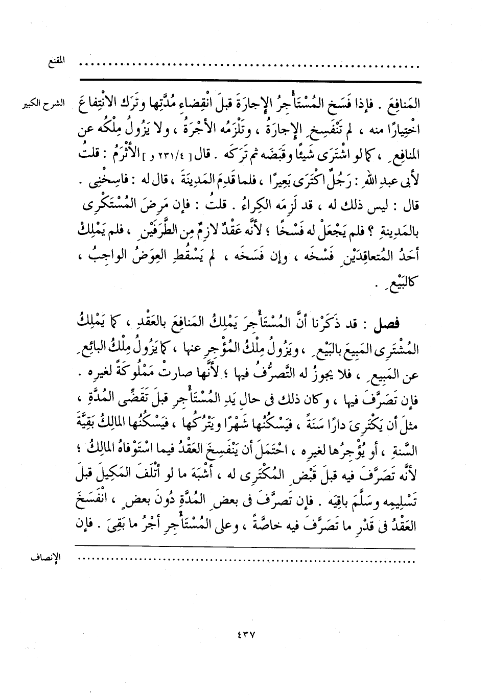 المَنافِعَ. فإذا فَسَخ المُسْتَأْجِرُ الإِجارَةَ قبلَ انْقِضاءِ مُدَّتها وتَرَك الانْتِفاعَ اخْتِيارًا منه، لم تَنْفَسِخِ الإِجارَةُ، وتَلْزَمُه الأجْرَةُ، ولا يَزُولُ مِلْكُه عن المنافِعِ، كما لو اشْتَرَى شَيئًا وقَبَضَه ثم تَرَكَه. قال الأثرَمُ: قلتُ لأبي عبدِ اللهِ: رَجُلٌ اكْتَرَى بَعِيرًا، فلما قَدِمَ المَدِينَةَ، قال له: فاسِخْنِي. قال: ليس ذلك له، قد لَزِمَه الكِراءُ. قلتُ: فإن مَرِضَ المُسْتَكْرِي بالمَدِينةِ؟ فلم يَجْعَلْ له فَسْخًا؛ لأنَّه عَقْدٌ لازِمٌ مِن الطَّرَفَينِ، فلم يَمْلِكْ أحَدُ المُتعاقِدَينِ فَسْخَه، وإن فَسَخَه، لم يَسْقُطِ العِوَضُ الواجِبُ، كالبَيعِ.