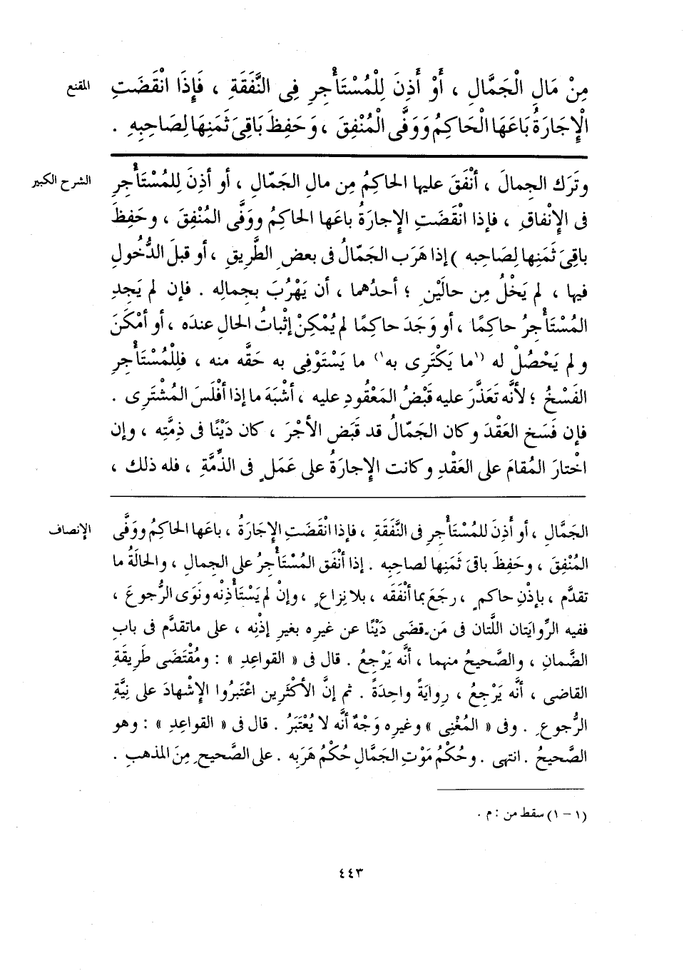 الجَمَّالِ، أو أذِنَ للمُسْتَأْجرِ في النَفَقَةِ، فإذا انْقَضَتِ الإجَارَةُ، باعَها الحاكِمُ ووَفَّى المُنْفِقَ، وحَفِظَ باقيَ ثَمَنِهَا لصاحِبِه. إذا أنْفَق المُسْتَأْجِرُ على الجِمالِ، والحالةُ ما تقدَّم، بإذْنِ حاكم، رجَعَ بما أنْفَقَه، بلا نِزاعٍ، وإنْ لم يَسْتَأْذِنْه ونَوَى الرُّجوعَ، ففيه الرِّوايَتان اللَّتان في مَن قضَى دَينًا عن غيرِه بغيرِ إذْنِه، على ما تقدَّم في بابِ الضمانِ، والصَّحيحُ منهما، أنَّه يَرْجِعُ. قال في «القواعِدِ»: ومُقْتَضَى طَرِيقَةِ القاضي، أنَّه يَرْجِعُ، رِوايَةً واحِدَةً. ثم إنَّ الأكْثَرِين اعْتَبرُوا الإِشهادَ على نِيَّةِ الرُّجوعِ. وفي «المُغْنِي» وغيرِه وَجْه أنَّه لا يُعْتَبَرُ. قال في «القواعِدِ»: وهو الصحيحُ. انتهى. وحُكْمُ مَوْتِ الجَمَّالِ حُكْمُ هَرَبِه. على الصَّحيحِ مِنَ المذهبِ.