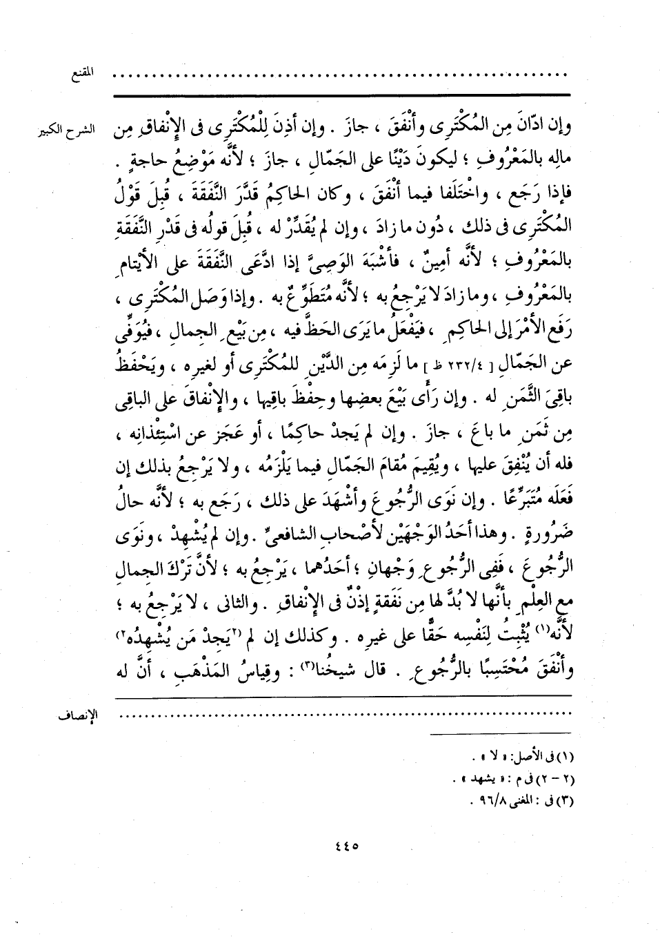 وإن ادّانَ مِن المُكْتَرِي وأنْفَقَ، جازَ. وإن أذِنَ لِلْمُكْتَرِى في الإِنْفاقِ مِن مالِه بالمَعْرُوفِ؛ ليكونَ دَينًا على الجَمّالِ، جازَ؛ لأنَّه مَوْضِعُ حاجةٍ. فإذا رَجَع، واخْتَلَفا فيما أنْفَقَ، وكان الحاكِمُ قَدَّرَ النَّفَقَةَ، قُبِلَ قَوْلُ المُكْتَرِي في ذلك، دُون ما زادَ، وإن لم يُقَدِّرْ له، قُبِلَ قولُه في قَدْرِ النَّفَقَةِ بالمَعْرُوفِ؛ لأنَّه أمِينٌ، فأشْبَهَ الوَصِيَّ إذا ادَّعَى النَّفَقَةَ على الأيتامِ بالمَعْرُوفِ، وما زادَ لا يَرْجِعُ به؛ لأنَّه مُتَطَوِّعٌ به. وإذا وَصَل المُكْتَرِي، رَفَع الأمْرَ إلى الحاكِمِ، فيَفْعَلُ ما يَرَى الحَظَّ فيه، مِن بَيعِ الجِمالِ، فيُوَفِّي عن الجَمّالِ ما لَزِمَه مِن الدَّينِ للمُكْتَرِي أو لغيرِه، ويَحْفَظُ باقِيَ الثَّمَنِ له. وإن رَأى بَيعَ بعضِها وحِفْظَ باقِيها، والإنْفاقَ على الباقِي مِن ثَمَنِ ما باعَ، جازَ. وإن لم يَجدْ حاكِمًا، أو عَجَز عن اسْتِئْذانِه، فله أن يُنْفِقَ عليها، ويُقِيمَ مُقامَ الجَمّالِ فيما يَلْزَمُه، ولا يَرْجِعُ بذلك إن فَعَلَه مُتَبَرِّعًا. وإن نَوَى الرُّجُوعَ وأشْهَدَ على ذلك، رَجَع به؛ لأنَّه حالُ ضَرُورةٍ. وهذا أحَدُ الوَجْهَين لأصْحابِ الشافعيِّ. وإن لم يُشْهِدْ، ونَوَى الرُّجُوعَ، فَفِي الرُّجُوعِ وَجْهانِ؛ أحَدُهما، يَرْجِعُ به، لأنَّ تَرْكَ الجِمالِ مع العِلْمِ بأنَّها لا بُدَّ لها مِن نَفَقةٍ إذْن في الإِنْفاقِ. والثاني، لا يَرْجِعُ به؛ لأنَّه (¬1) يُثْبِتُ لِنَفْسِه حَقًّا على غيرِه. وكذلك إن لم [يَجِدْ مَن يُشْهِدُه] (¬2) وأنْفَقَ مُحْتَسِبًا بالرُّجُوعِ. قال شيخُنا (¬3): وقِياسُ المَذْهَبِ، أنَّ له