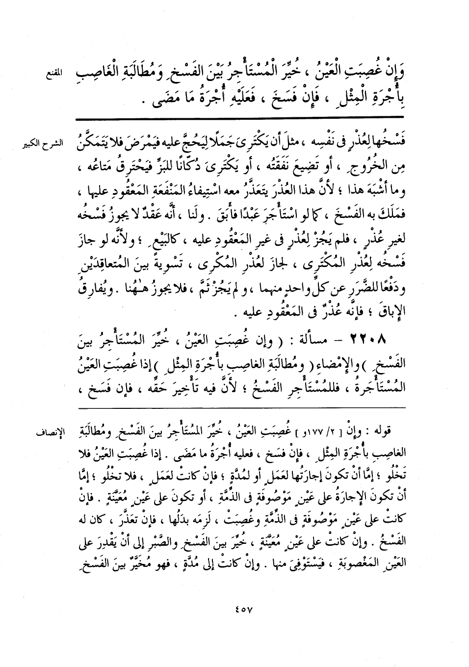قوله: وإنْ غُصِبَتِ العَينُ، خُيِّرَ المسُتَأْجِرُ بينَ الفَسْخِ ومُطالبَةِ الغاصِبِ بأُجْرَةِ المِثْلِ، فإنْ فسَخ، فعليه أُجْرَةُ ما مَضَى. إذا غُصِبَتِ العَينُ فلا تَخْلُو؛ إمَّا أنْ تكونَ إِجارَتُها لعَمَلٍ أو لمُدَّةٍ؛ فإنْ كانتْ لعَمَلٍ، فلا تخْلُو؛ إمَّا أنْ تكونَ الإجارَةُ على عَينٍ مَوْصُوفةٍ في الذِّمَّةِ، أو تكونَ على عَين مُعَيَّنَةٍ. فإنْ كانتْ على عَينٍ مَوْصُوفَةٍ في الذِّمَّةِ وغُصِبَتْ، لَزِمَه بدَلُها، فإنْ تعَذَّرَ، كان له الفَسْخُ. وإنْ كانتْ على عَينٍ مُعَيَّنَةٍ، خُيِّرَ بينَ الفَسْخِ والصَّبْرِ إلى أنْ يَقْدِرَ على العَينِ المَغْصوبَةِ، فيَسْتَوْفِيَ منها. وإنْ كانتْ إلى مُدَّةٍ، فهو مُخَيَّرٌ بينَ الفَسْخِ