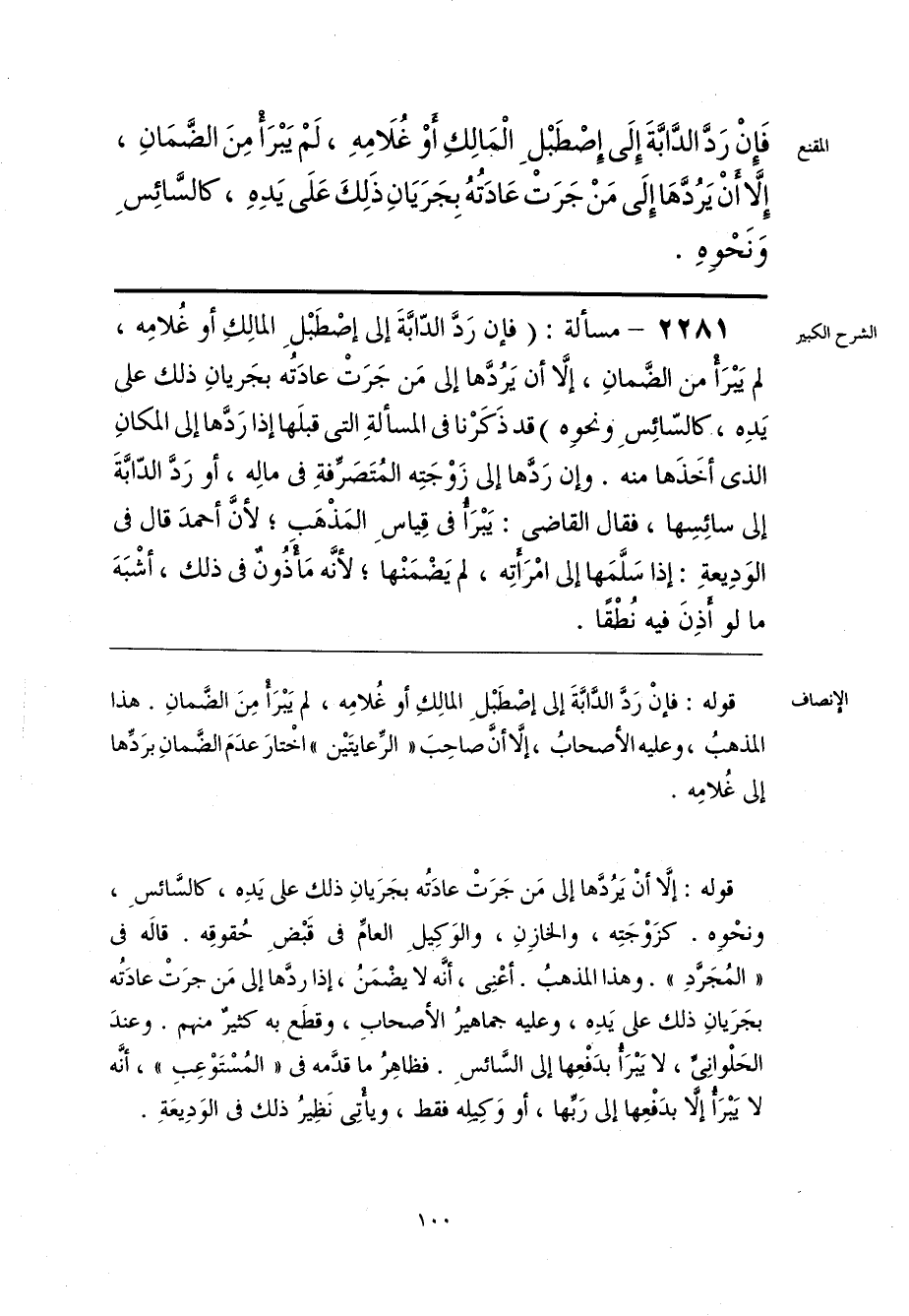 قوله: فإنْ رَدَّ الدَّابَّةَ إلى إصْطَبْلِ المالِكِ أو غُلامِه، لم يَبْرَأْ مِنَ الضَّمانِ. هذا المذهبُ، وعليه الأصحابُ، إلَّا أنَّ صاحِبَ «الرِّعايتَين» اخْتارَ عدَمَ الضَّمانِ برَدِّها إلى غُلامِه.
