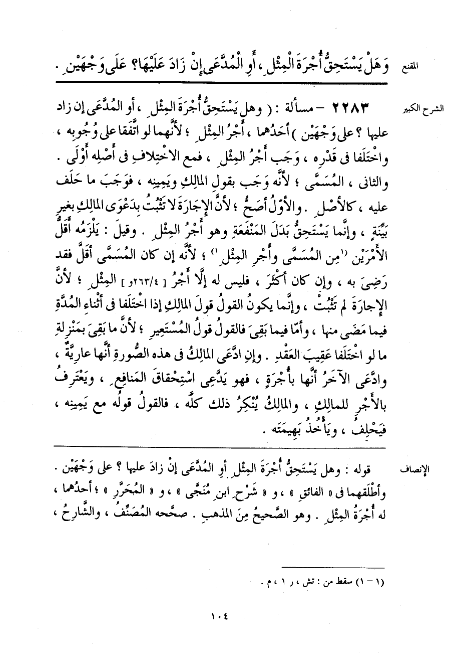 قوله: وهل يَسْتَحِقُّ أُجْرَةَ المِثْلِ أو المُدَّعَى إنْ زادَ عليها؟ على وَجْهَين. وأطْلَقهما في «الفائقِ»، و «شَرْحِ ابنِ مُنَجَّى»، و «المُحَررِ»؛ أحدُهما، له أجْرَةُ المِثْلِ. وهو الصَّحيحُ مِنَ المذهبِ. صحَّحه المُصَنِّفُ، والشَّارِحُ،