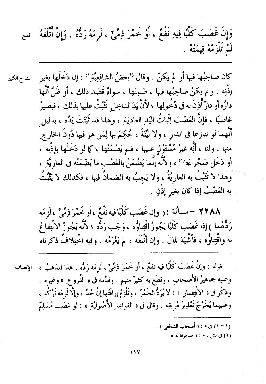 قوله: وإنْ غَصَبَ كَلْبًا فيه نَفْعٌ، أو خَمْرَ ذِمِّيٍّ، لَزِمَه رَدُّه. هذا المذهبُ، وعليه جماهيرُ الأصحابِ، وقطَع به كثيرٌ منهم. وقدَّمه في «الفُروعِ» وغيرِه. وذكَر في «الانْتِصارِ»: لا يُرَدُّ الخَمْرُ، وتَلْزَمُ إراقَتُها إنْ حُدَّ، وإلَّا لَزِمَه تَرْكُه، وعليهما يُخَرَّجُ تَعْذِيرُ مُرِيقِه. وقال في «القواعِدِ الأصُولِيَّةِ»: لو غصَبَ مُسْلِمْ