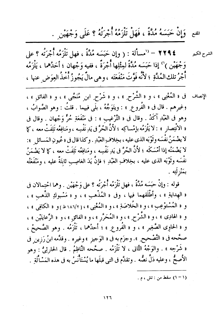 قوله: وإنْ حبَسَه مُدَّةً، فهل تَلْزَمُه أُجْرَتُه؟ على وَجْهَين. وهما احْتِمالان في «الهِدايةِ»، وأطْلَقهما فيها، وفي «المُذْهبِ»، و «مَسْبوكِ الذَّهبِ»، و «المُسْتوْعِبِ»، و «الخُلاصَةِ»، و «المُغْنِي»، و «الكافِي»، و «الهادِي»، و «الشَّرْحِ»، و «المُحَرَّرِ»، و «الفائقِ»، و «الرِّعايتَين»، و «الحاوي الصَّغِيرِ»، و «الفُروعِ»؛ أحدُهما، تَلْزَمُه. وهو الصَّحيحُ، صحَّحه في «التَّصْحيحِ». وجزَم به في «الوَجيزِ» وغيرِه. وقدَّمه ابنُ رَزِينٍ في «شَرْحِه». والوَجْهُ الثَّاني، لا تَلْزَمُه. صحَّحه النَّاظِمُ. قال الحارِثِيُّ: وهو الأصحُّ، وعليه دَلَّ نصُّه. وتقدَّم في التي قبلَها ما يسْتَأْنَسُ به في هذه المَسْألةِ.