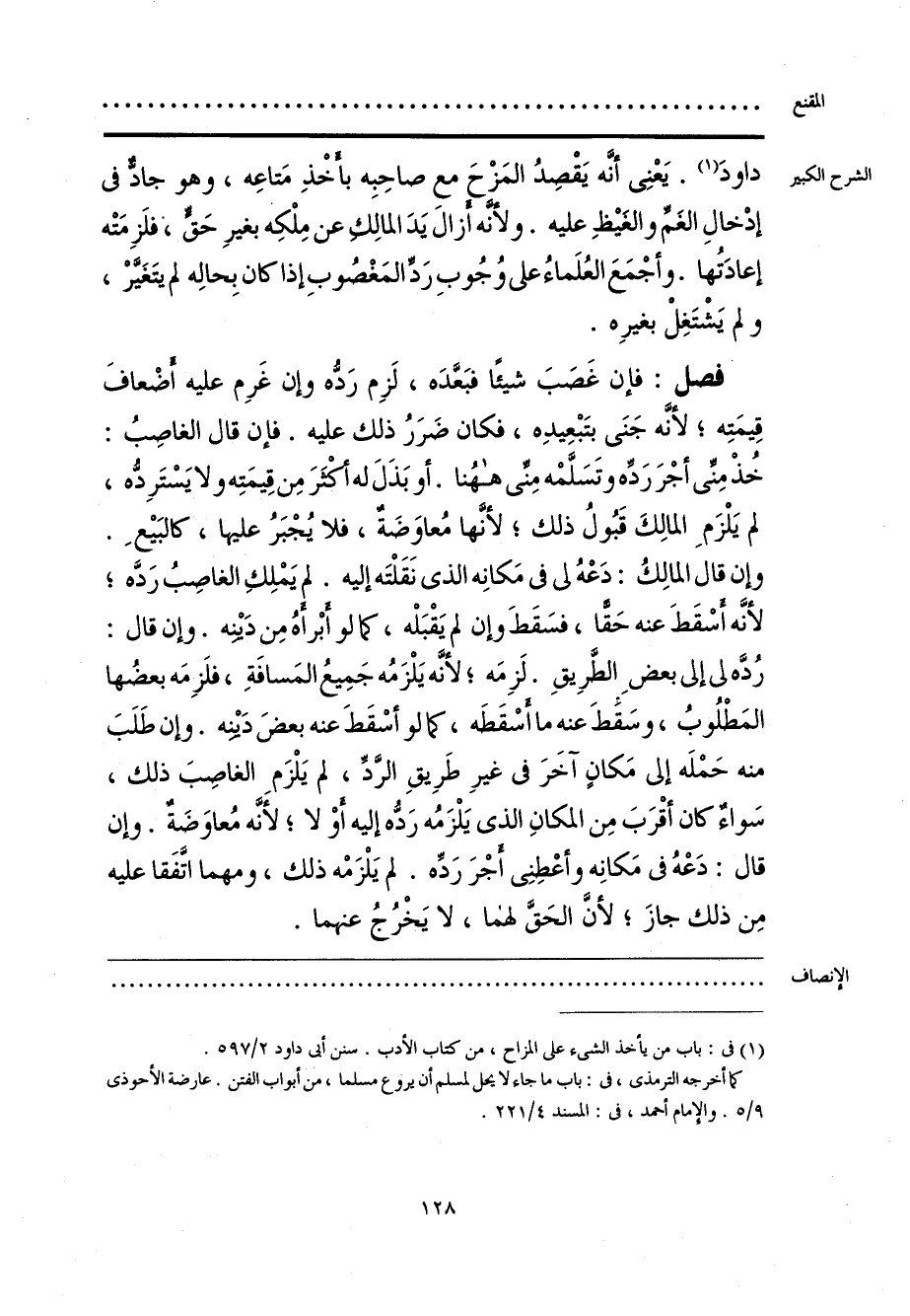 داودَ (¬1). يَعْنِي أنَّه يَقْصِدُ المَزْحَ مع صاحِبِه بأَخْذِ مَتاعِه، وهو جادٌّ في إدْخالِ الغَمِّ والغَيظِ عليه. ولأنَّه أَزال يَدَ المالِكِ عن مِلْكِه بغيرِ حَقٍّ، فلَزِمَتْه إعادَتُها. وأجْمَعَ العُلَماءُ على وُجُوبِ رَدِّ المَغْصُوبِ إذا كان بِحالِه لم يتَغَيرْ، ولم يَشْتَغِلْ بغيرِه.