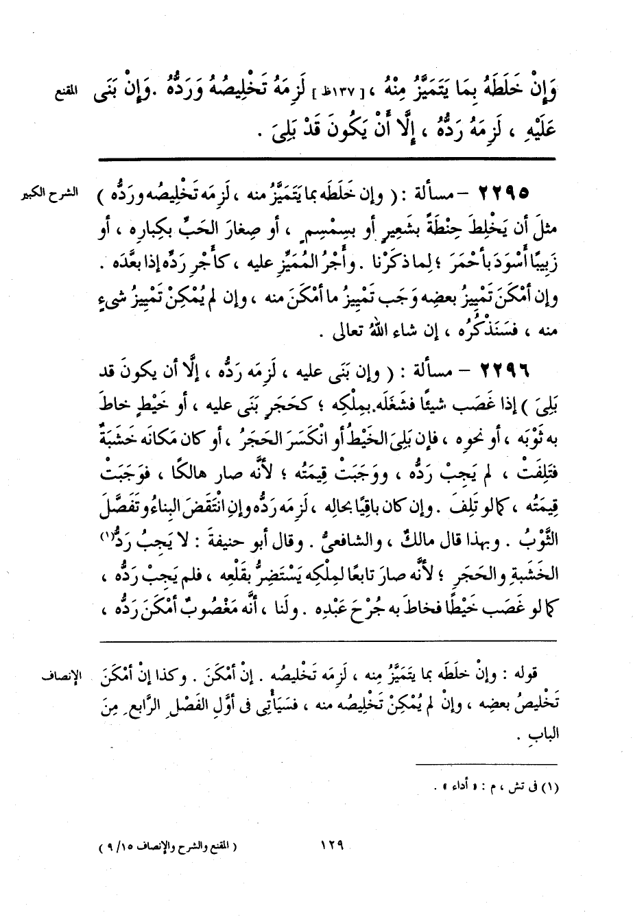 قوله: وإنْ خلَطَه بما يتَمَيَّزُ مِنه، لَزِمَه تَخْليصُه. إنْ أمْكَنَ. وكذا إنْ أمْكَنَ تَخْليصُ بعضِه، وإنْ لم يُمْكِنْ تَخْلِيصُه منه، فسَيَأتِي في أوَّلِ الفَصْلِ الرَّابعِ مِنَ البابِ.