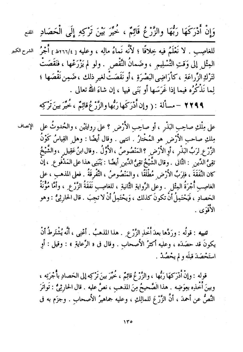 قوله: وإنْ أَدْرَكهَا رَبُّها، والزَّرْعُ قائِمٌ، خُيِّرَ بينَ تَرْكِه إلى الحَصادِ بأْجْرَتِه، وبينَ أَخْذِه بعِوَضِه. هذا الصَّحيحُ مِنَ المذهبِ، نصَّ عليه. قال الحارِثِيُّ: تَواتَرَ النَّصُّ عن أحمدَ، أنَّ الزَّرْعَ للمالِكِ، وعليه جماهيرُ الأصحابِ. وجزَم به في