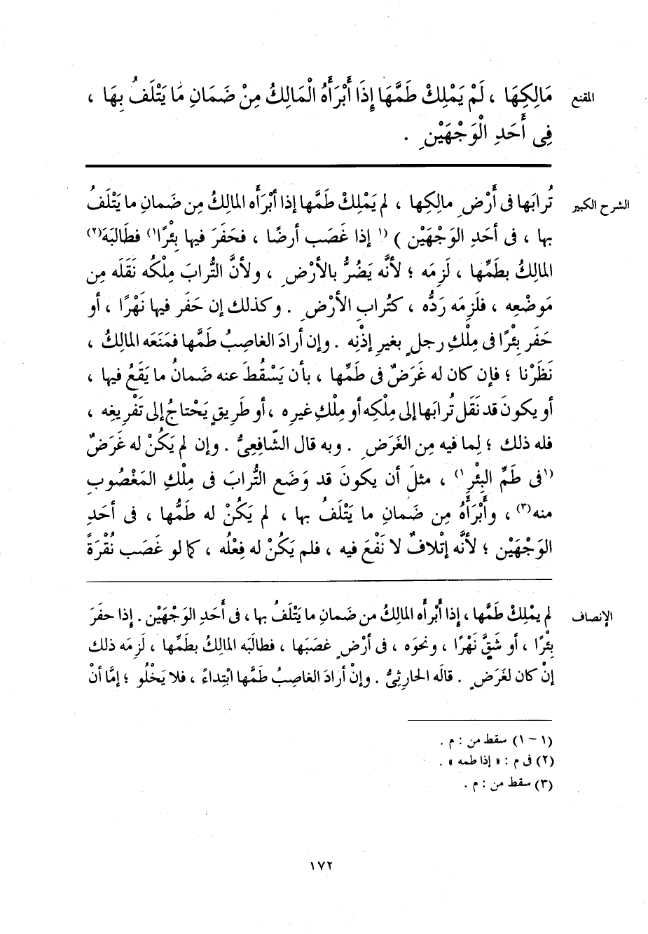 لم يمْلِكْ طَمَّها، إذا أَبْرأَه المالِكُ من ضَمانِ ما يَتْلَفُ بها، في أَحَدِ الوَجْهَين. إذا حفَرَ بِئْرًا، أو شَقَّ نَهْرًا، ونحوَه، في أرْضٍ غصَبَها، فطالبَه المالِكُ بطَمِّها، لَزِمَه ذلك إنْ كان لغَرَضٍ. قاله الحارِثِيُّ. وإنْ أرادَ الغاصِبُ طَمَّها ابْتِداءً، فلا يَخْلُو؛ إمَّا أنْ
