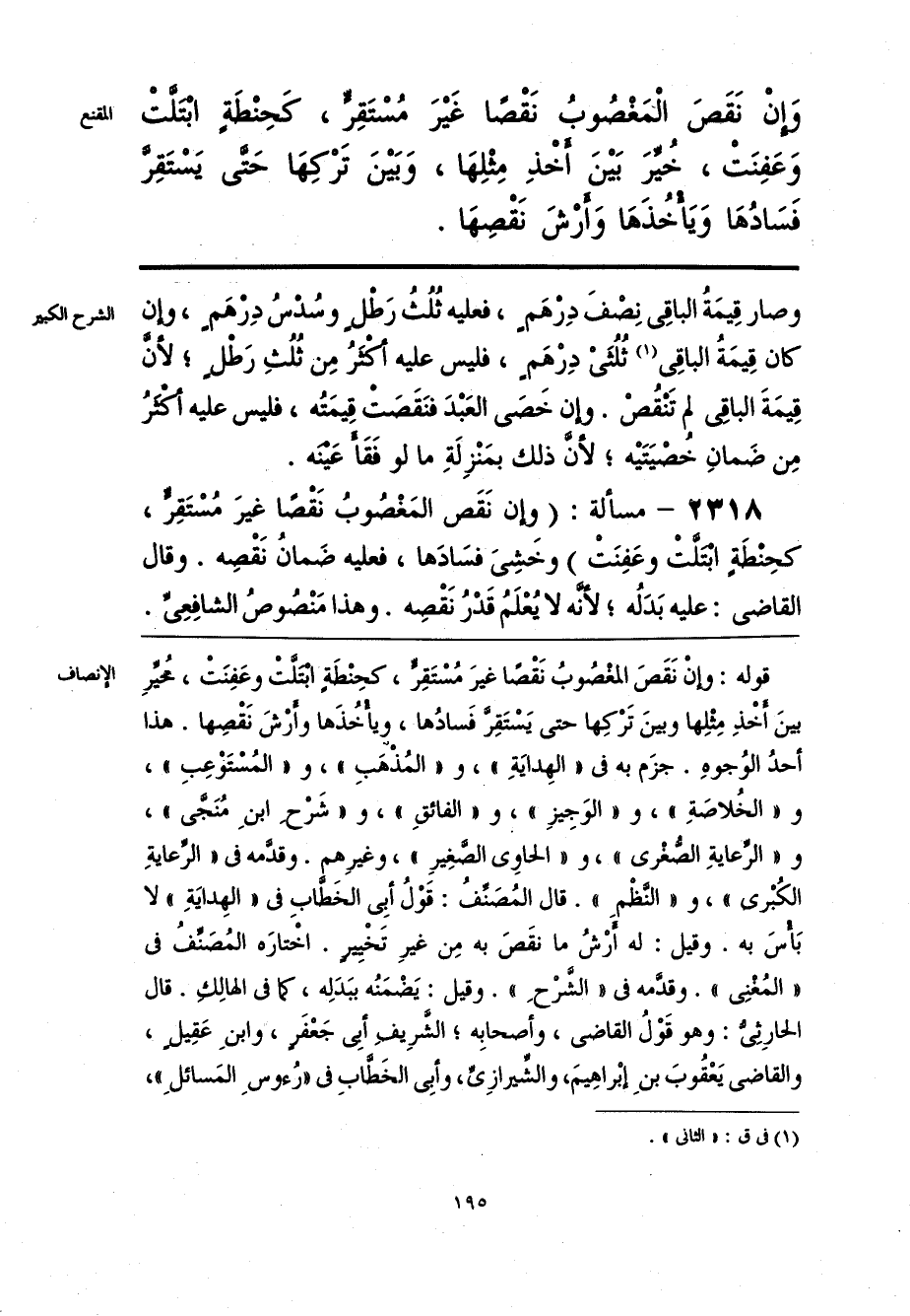 قوله: وإنْ نَقَصَ المغْصُوبُ نَقْصًا غيرَ مُسْتَقِرٍّ، كحِنْطَةٍ ابْتَلَّتْ وعَفِنَتْ، مُحيِّرِ بينَ أَخْذِ مِثْلِها وبينَ تَرْكِها حتى يَسْتَقِرَّ فَسادُها، ويأْخُذَها وأَرْشَ نَقْصِها. هذا أحدُ الوُجوهِ. جزَم به في «الهِدايَةِ»، و «المُذْهَبِ»، و «المُسْتَوْعِبِ»، و «الخُلاصَةِ»، و «الوَجِيزِ»، و «الفائقِ»، و «شَرْحِ ابنِ مُنَجَّى»، و «الرِّعايةِ الصُّغْرى»، و «الحاوي الصَّغِيرِ»، وغيرِهم. وقدَّمه في «الرِّعايةِ الكُبْرى»، و «النَّظْمِ». قال المُصَنِّفُ: قَوْلُ أبِي الخَطَّابِ في «الهِدايَةِ» بَأْسَ به. وقيل: له أَرْشُ ما نقَصَ به مِن غيرِ تَخْيِيرٍ. اخْتارَه المُصَنِّفُ في «المُغنِي». وقدَّمه في «الشَّرْحِ». وقيل: يَضْمَنُه ببَدَلِه، كما في الهالِكِ. قال الحارِثِيُّ: وهو قَوْلُ القاضي، وأصحابِه؛ الشَّرِيفِ أبِي جَعْفَرٍ، وابنِ عَقِيلٍ، والقاضي يَعْقُوبَ بنِ إبْراهِيمَ، والشِّيرازِيِّ، وأبِي الخَطَّابِ في «رُءوسِ المَسائلِ»،