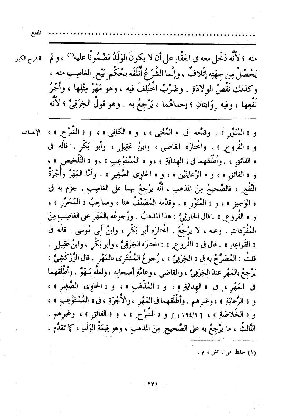 و «المُنَوِّرِ». وقدَّمه في «المُغْنِي»، و «الكافِي»، و «الشَّرْحِ»، و «الفُروعِ». واخْتارَه القاضي، وابنُ عَقِيل، وأبو بَكْر. قاله في «الفائقِ». وأطْلَقهما في «الهِدايَةِ»، و «المُسْتَوْعِبِ»، و «التَّلْخيص»، و «الفائقِ»، و «الرِّعايتَين»، و «الحاوي الصَّغِيرِ». وأمَّا المَهْرُ وأُجْرَةُ النَّفْعِ، فالصحيحُ مِنَ المذهبِ، أنَّه يرْجِعُ بهما على الغاصِبِ. جزَم به في «الوَجيزِ»، و «المُنَوِّرِ». وقدَّمه المُصَنِّفُ هنا، وصاحِبُ «المُحَرَّرِ»، و «الفُروعِ». قال الحارِثِي: هذا المذهبُ. ورُجوعُه بالمَهْرِ على الغاصِبِ مِنَ المُفْرَداتِ. وعنه، لا يرجِعُ. اخْتارَه أبو بَكْر، وابنُ أبِي مُوسى. قاله في «القَواعِدِ». قال في «الفُروعِ»: اخْتارَه الخِرَقِيُّ، وأبو بَكْر، وابنُ عَقِيل. قلتُ: المُصَرَّحُ به في «الخِرَقي»، رُجوعُ المشتَرِى بالمَهْرِ. قال الزَّركَشِي: يرجِعُ بالمَهْرِ عندَ الخِرَقِي، والقاضي، وعامَّةِ أصحابِه، ولعله سَهْوٌ. وأطْلَقهما في المَهرِ، في «الهِدايَةِ»، و «المُذْهَبِ»، و «الحاوي الصغِيرِ»، و «الرِّعايَةِ»، وغيرِهم. وأطْلَقهما في المَهْرِ، والأُجْرَةِ، في «المُسْتَوْعِبِ»، و «الخُلاصَةِ»، و «الشرْحِ»، و «الفائقِ»، وغيرِهم. الثالثُ، ما يرْجِعُ به على الصَّحيحِ مِنَ المذهبِ، وهو قِيمَةُ الوَلَدِ، كما تقدّم.