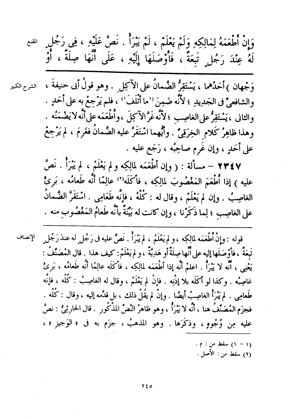 قوله: وإنْ أطْعَمَه لمالِكِه، ولم يَعْلَمْ، لم يَبْرَأ. نَصَّ عليه في رَجُل له عندَ رَجُل تَبِعَةٌ، فأوْصَلَها إليه على أنها صِلَة أو هَدِيَّة، ولم يَعْلَمْ: كيف هذا. قال المُصَنِّفُ: يَعْنِي، أنَّه لا يَبْرأُ. اعلمْ أنَّه إذا أطْعَمه لمالِكِه، فأكَلَه عالِمًا أنَّه طَعامُه، بَرِئ غاصِبُه. وكذا لو أكَلَه بلا إذْنِه. فإذ لم يَعْلَمْ، وقال له الغاصِبُ: كُلْه، فإنَّه طَعامِي. لم يبرَأ الغاصِبُ أَيضًا. وإنْ لم يقُلْ ذلك، بل قدَّمه إليه، وقال: كُلْه. فجزَم المُصَنِّفُ هنا، أنَّه لا يَبْرأ، وهو ظاهر النَّص المذْكُورِ. قال الحارِثِيُّ: نصَّ عليه مِن وُجُوه، وذكَرَها. وهو المذهبُ، جزَم به في «الوَجيزِ»،