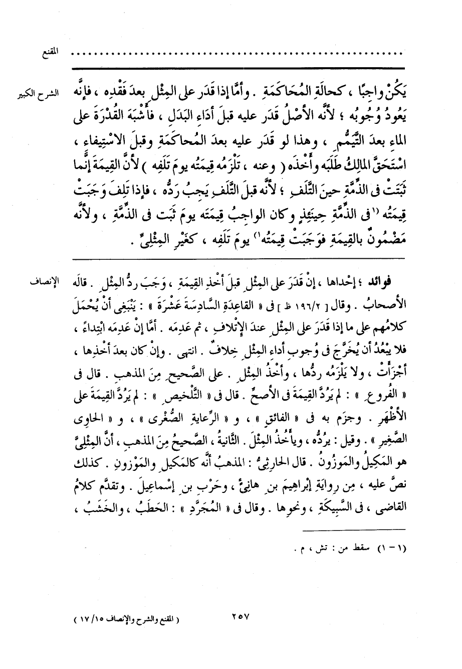 فوائد، إحْداها، إنْ قَدَرَ على المِثْل قبلَ أخْذِ القِيمَةِ، وَجَبَ ردُّ المِثْلِ. قاله الأصحابُ. وقال في «القاعِدَةِ السَّادِسَة عَشْرَةَ»: يَنْبَغِي أنْ يُحْمَلَ كلامُهم على ما إذا قَدَرَ على المِثْلِ عندَ الإِتْلافِ، ثم عَدِمَه. أمَّا إنْ عَدِمَه ابْتِداءً، فلا يبْعُدُ أن يُخَرجَ في وُجوبِ أداءِ المِثْلِ خِلافٌ. انتهى. وإنْ كان بعدَ أخْذِها، أجْزَأتْ، ولا يَلْزَمُه ردُّها، وأخْذُ المِثْلِ. على الصَّحيحِ مِنَ المذهبِ. قال في «الفُروعِ»: لم يَرُدَّ القِيمَةَ في الأصح. قال في «التَّلْخيصِ»: لم يَرُدَّ القِيمَةَ على الأظْهَرِ. وجزَم به في «الفائقِ»، و «الرِّعايةِ الصُّغْرى»، و «الحاوي الصَّغِيرِ». وقيل: يرُدُّه، ويأخُذُ المِثْلَ. الثَّانيةُ، الصَّحيحُ مِنَ المذهبِ، أن المِثْلِي هو المَكِيلُ والمَوزُونُ. قال الحارِثِي: المذهبُ أنَّه كالمَكيلِ والمَوْزونِ. كذلك نصَّ عليه، مِن رِوايَةِ إبْراهِيمَ بنِ هانِئ , وحَرْبِ بنِ إسْماعِيلَ. وتقدَّم كلامُ القاضي، في السَّبِيكَةِ، ونحوها. وقال في «المُجَرَّدِ»: الحَطَبُ، والخَشَبُ،