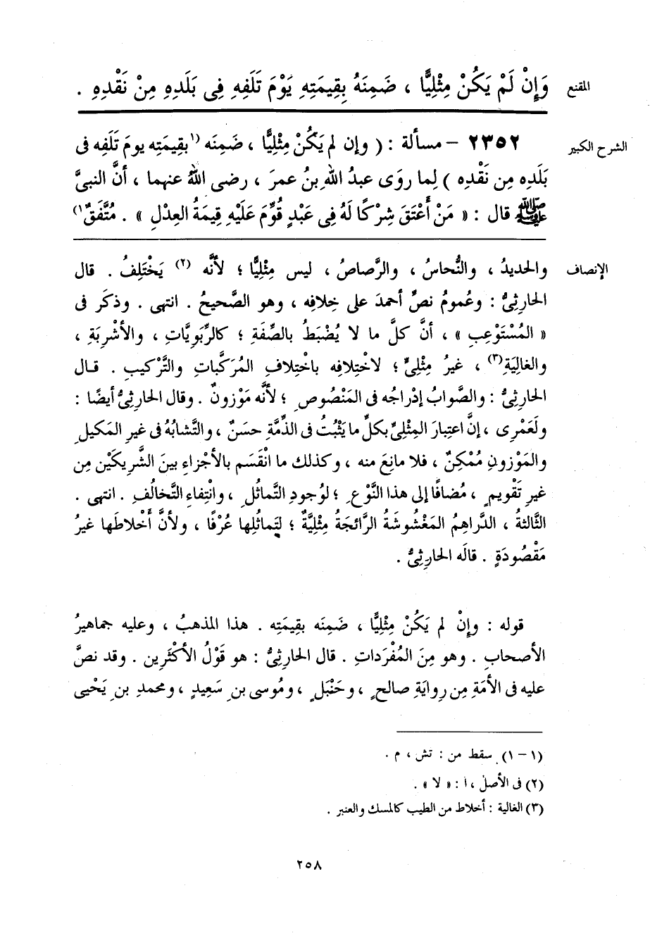 قوله: وإنْ لم يَكُنْ مِثْلِيًّا، ضَمِنَه بقِيمَتِه. هذا المذهبُ، وعليه جماهيرُ الأصحاب. وهو مِنَ المُفْرَداتِ. قال الحارِثِيُّ: هو قَوْلُ الأكْثَرِين. وقد نصَّ عليه في الأَمَةِ مِن رِوايَةِ صالح، وحَنْبَل، ومُوسى بنِ سَعِيدٍ، ومحمدِ بنِ يَحْيى