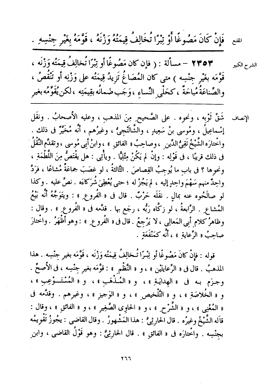 قوله: فإنْ كانَ مَصُوغًا أو تِبْرًا تُخالِفُ قِيمَتُه وَزْنَه، قَوَّمَه بغيرِ جِنْسِه. هذا المذهبُ. قال في «الرِّعايتَين»، و «النَّظْمِ»: قوَّمَه بغيرِ جِنْسِه، في الأصحِّ. وجزَم به في «الهِدايَةِ»، و «المُذْهَبِ»، و «المُسْتَوْعِبِ»، و «الخُلاصَةِ»، و «التَّلْخيصِ»، و «الوَجيزِ»، وغيرِهم. وقدَّمه في «المُغْنِي»، و «الشرْحِ»، و «الحاوي الصَّغِيرِ»، و «الفائقِ»، وقال: قاله الشَّيخُ وغيرُه. قال الحارِثِيُّ: هذا المَشْهورُ. وقال القاضي: يجُوزُ تَقْويمُه بجِنْسِه. واخْتارَه في «الفائقِ». قال الحارِثِي: وهو قوْلُ القاضي، وابنِ