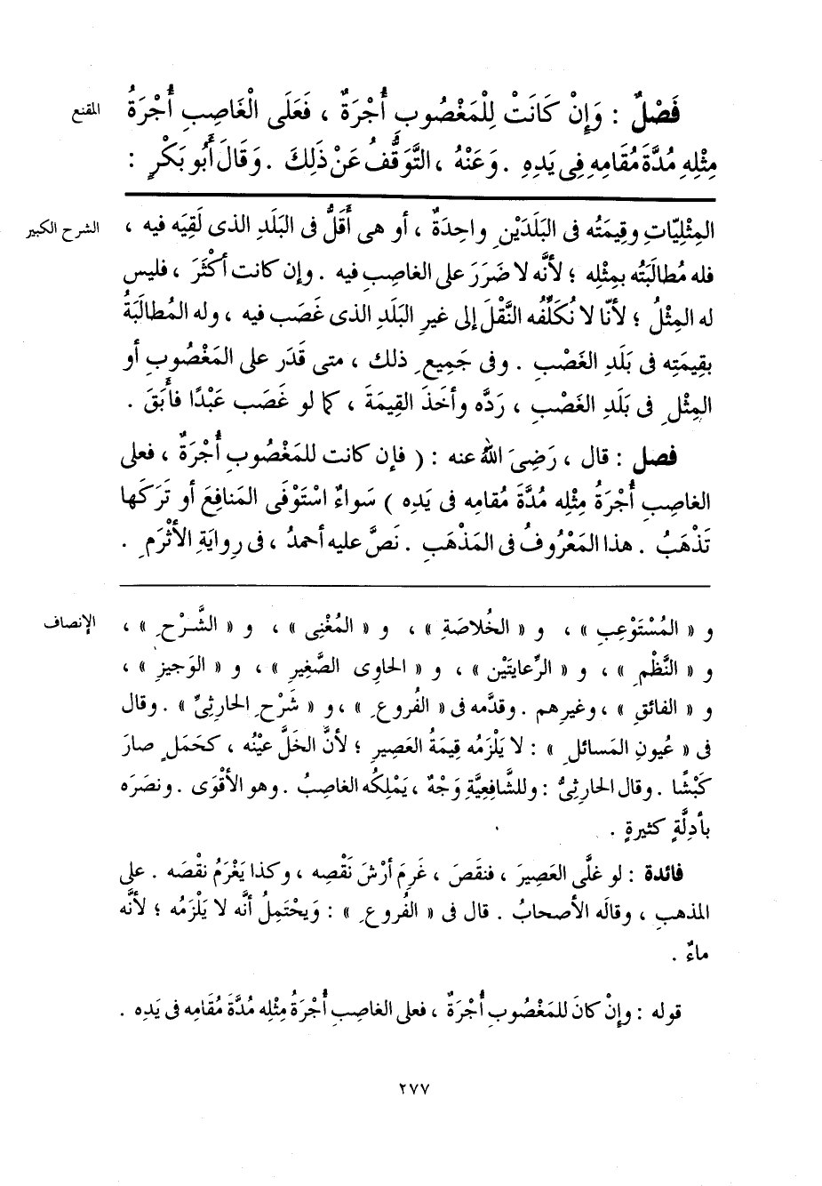 قوله: وإنْ كانَ للمَغْصُوبِ أُجْرَةٌ، فعلى الغاصِبِ أُجْرَةُ مِثْلِه مُدَّةَ مُقَامِه في يَدِه.