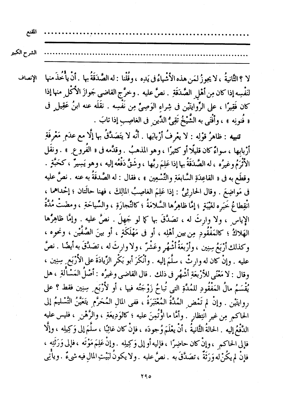 تنبيه: ظاهرُ قوْلِه: لا يعْرِفُ أرْبابَها. أنَّه لا يتَصَدَّقُ بها إلَّا مع عدَمِ مَعْرِفَةِ أرْبابِها، سواءٌ كان قليلًا أو كثيرًا، وهو المذهبُ. وقدَّمه في «الفُروعِ». ونقَل الأثْرَمُ وغيرُه، له الصَّدَقَةُ بها إذا عَلِمَ ربَّها، وشَقَّ دَفْعُه إليه، وهو يَسِيرٌ، كحَبَّةٍ. وقطَع به في «القاعِدَةِ السَّابعَةِ والتِّسْعِين»، فقال: له الصَّدقَةُ به عنه. نصَّ عليه في مَواضِعِ. وقال الحارِثِيُّ: إذا عَلِمَ الغاصِبُ المالِكَ، فهنا حالتان؛ إحْداهما، انْقِطاعُ خبَرِه لغيبَةٍ؛ إمَّا ظاهِرُها السَّلامَةُ؛ كالتِّجارَةِ، والسِّياحَةِ، ومضَتْ مُدَّةُ الإياسِ، ولا وارِثَ له، تصَدَّقَ بها كما لو جَهِلَ. نصَّ عليه. وإمَّا ظاهِرها الهَلاكُ؛ كالمَفْقُودِ مِن بينِ أهْلِه، أو في مَهْلَكَةٍ، أو بينَ الصَّفَّين، ونحوه، وكذلك أرْبَعُ سِنِين، وأربعَةُ أشْهُرٍ وعَشْرٌ، ولا وارِثَ له، تصَدَّقَ به أيضًا. نصَّ عليه. وإنْ كان له وارِثٌ، سلَّمَ إليه. وأنْكَرَ أبو بَكْرٍ الزِّيادَةَ على الأرْبَعِ سِنِين، وقال: لا مَعْنًى للأرْبعَةِ أشْهُرٍ في ذلك. قال القاضي وغيرُه: أصْلُ المَسْأَلةِ، هل يُقْسَمُ مالُ المَفْقُودِ للمُدَّةِ التي تُباحُ زَوْجَتُه فيها، أو لأرْبَعِ سِنِين فقط؟ على رِوايتَين. وإنْ لم تَمْضِ المُدَّةُ المُعْتَبَرَةُ، ففي المالِ المُحَرَّمِ يتَعَيَّنُ التَّسْليمُ إلى الحاكمِ مِن غيرِ انْتِظارٍ. وأمَّا ما اؤْتُمِنَ عليه؛ كالوَدِيعَةِ، والرَّهْنِ، فليس عليه الدَّفْعُ إليه. الحالةُ الثَّانيةُ، أنْ يعْلَمَ وُجودَه، فإنْ كان غائِبًا، سلَّمَ إلى وَكِيلِه، وإلَّا فإلى الحاكمِ، وإنْ كان حاضِرًا، فإليه أو إلى وَكِيلِه. وإنْ عَلِمَ مَوْتَه، فإلى وَرَثَتِه، فإن لم يكُنْ له وَرَثَةٌ، تصَدَّقَ به. نصَّ عليه. ولا يكون لبَيتِ المالِ فيه شيءٌ. ويأْتِي