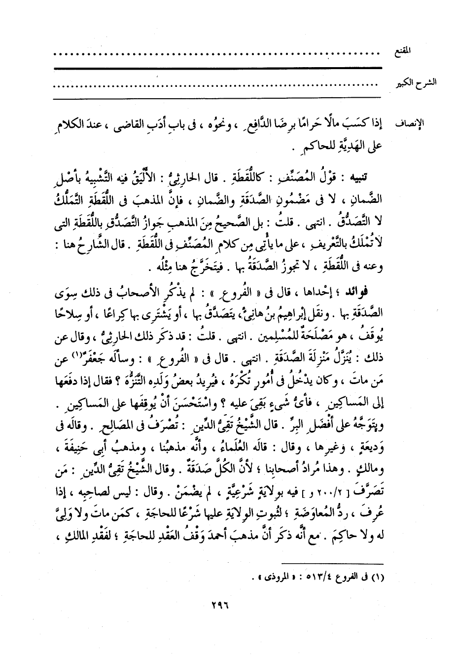 تنبيه: قوْلُ المُصَنِّف: كاللُّقَطَةِ. قال الحارِثِيُّ: الأَلْيَقُ فيه التَّشْبِيهُ بأصْلِ الضَّمانِ، لا في مَضْمُونِ الصَّدَقَةِ والضَّمانِ، فإنَّ المذهبَ في اللُّقَطَةِ التَّمَلُّكُ لا التَّصَدُّقُ. انتهى. قلتُ: بل الصَّحيحُ مِنَ المذهبِ جَوازُ التَّصَدُّقِ باللُّقَطَةِ التي لا تُمْلَكُ بالتَّعْريفِ، على ما يأْتِي مِن كلامِ المُصَنِّفِ في اللُّقَطَةِ. قال الشَّارِحُ هنا: وعنه في اللُّقَطَةِ، لا تجوزُ الصَّدَقَةُ بها. فيتَخَرَّجُ هنا مِثْلُه.