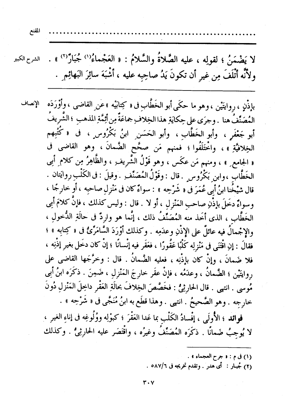 بإذْنٍ، رِوايتَين، وهو ما حكَى أبو الخَطَّابِ في «كِتابَيه» عنِ القاضي، وأوْرَدَه المُصَنِّفُ هنا. وجرَى كل حِكايَةِ هذا الخِلافِ جماعَةٌ مِن أئِمَّةِ المذهبِ؛ الشَّرِيفُ أبو جَعْفَرٍ، وأبو الخَطَّابِ، وأبو الحَسَنِ بنُ بَكْرُوسٍ، في «كُتُبِهم الخِلافيَّةِ»، واخْتَلَفُوا؛ فمنهم مَن صحَّح الضَّمانَ، وهو القاضي في «الجامعِ»، ومنهم مَن عكَس، وهو قَوْلُ الشَّرِيفِ، والظَّاهِرُ مِن كلامِ أبِي الخَطَّابِ، وابنِ بَكْرُوسٍ. قال: وقَوْلُ المُصَنِّفِ. وقيلَ: في الكَلْبِ رِوايَتان. قال شيخُنا ابنُ أبِي عُمَرَ في «شَرْحِه»: سواءٌ كان في مَنْزِلِ صاحبِه، أو خارِجًا، وسواءٌ دخَلَ بإذْنِ صاحبِ المَنْزِلِ، أو لا. قال: وليس كذلك، فإنَّ كلامَ أبِي الخَطَّابِ، الذي أخَذ منه المُصَنِّفُ ذلك، إنَّما هو وارِدٌ في حالةِ الدُّخولِ، والإِجْمالُ فيه عائلٌ على الإِذْنِ وعدَمِه. وكذلك أوْرَدَ السَّامَرِّيُّ في «كِتابِه»؛ فقال: إنِ اقْتَنَى في مَنْزِلِه كَلْبًا عَقُورًا، فعَقَر فيه إنْسانًا؛ إنْ كان دخَل بغيرِ إذْنِه، فلا ضَمانَ، وإنْ كان بإذْنِه، فعليه الضَّمانُ. قال: وخرَّجَها القاضي على رِوايتَين؛ الضَّمانُ، وعدَمُه، فإنْ عقَر خارِجَ المَنْزِلِ، ضَمِنَ. ذكَرَه ابنُ أبِي مُوسى. انتهى. قال الحارِثِيُّ: فخَصَّصَ الخِلافَ بحالةِ العَقْرِ داخِلَ المَنْزلِ دُونَ خارِجِه. وهو الصَّحيحُ. انتهى. وهذا قطَع به ابنُ مُنَجَّى في «شَرْحِه».