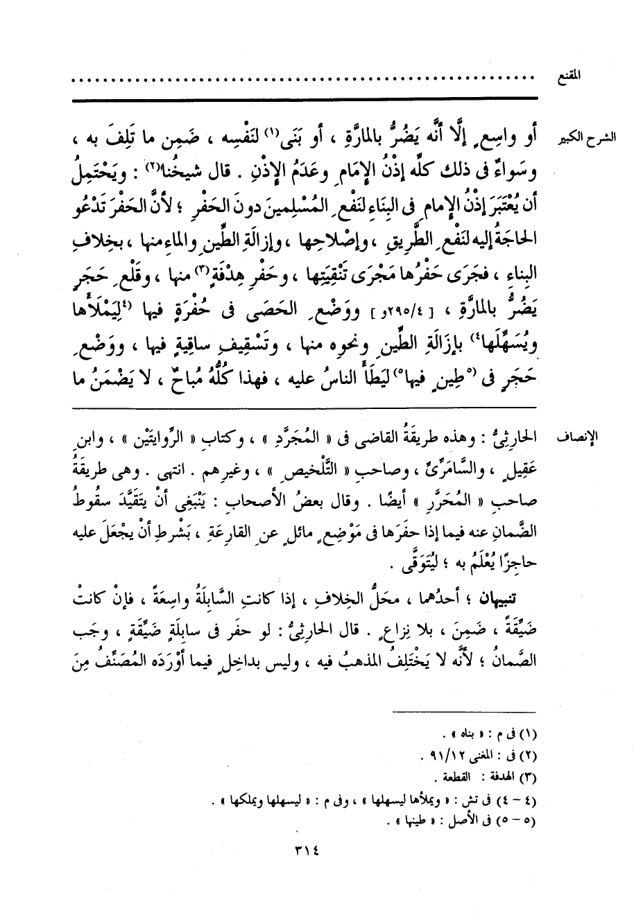 الحارِثِيُّ: وهذه طريقَةُ القاضي في «المُجَرَّدِ»، وكتابِ «الرِّوايتَين»، وابنِ عَقِيلٍ، والسَّامَرِّي، وصاحبِ «التَّلْخيصِ»، وغيرِهم. انتهى. وهي طريقَةُ صاحبِ «المُحَرَّرِ» أيضًا. وقال بعضُ الأصحابِ: يَنْبَغِي أنْ يتَقَيَّدَ سقُوطُ الضَّمانِ عنه فيما إذا حفَرَها في مَوْضِعٍ مائلٍ عنِ القارِعَةِ، بَشْرطِ أنْ يجْعَلَ عليه حاجِزًا يُعْلَمُ به؛ ليُتَوَقَّى.