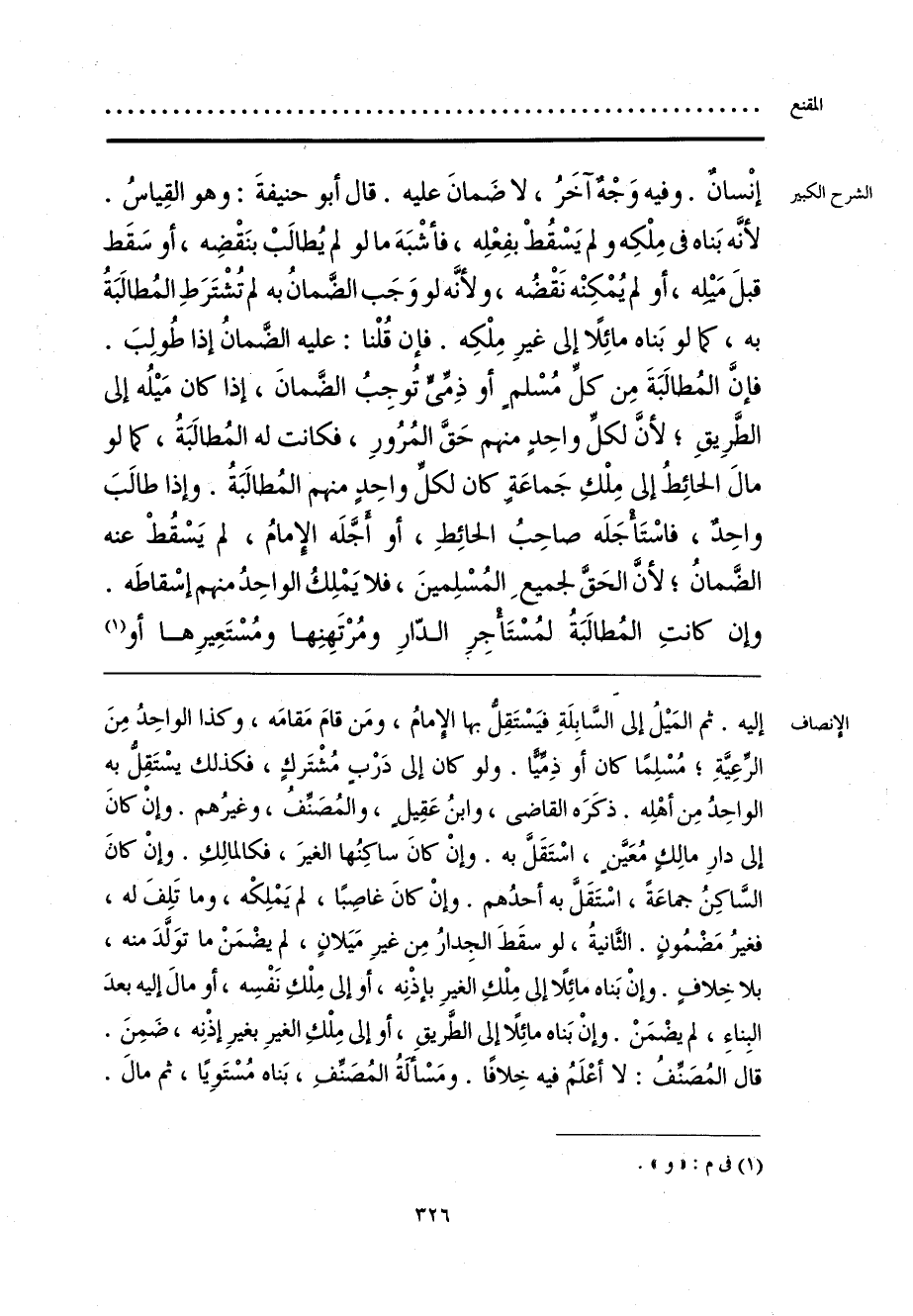 إليه. ثم المَيلُ إلى السَّابلَةِ فيَسْتَقِلُّ بها الإِمامُ، ومَن قامَ مَقامَه، وكذا الواحِدُ مِنَ الرعِيَّةِ؛ مُسْلِمًا كان أوَ ذِمِّيًّا. ولو كان إلى دَرْبٍ مُشْتَركٍ، فكذلك يسْتَقِلُّ به الواحِدُ مِن أهْلِه. ذكَرَه القاضي، وابنُ عَقِيلٍ، والمُصَنِّفُ، وغيرُهم. وإنْ كانَ إلى دارِ مالكٍ مُعَيَّنٍ، اسْتَقَلَّ به. وإنْ كانَ ساكِنُها الغيرَ، فكالمالِكِ. وإنْ كانَ السَّاكِنُ جماعَةً، اسْتَقَلَّ به أحدُهم. وإنْ كانَ غاصِبًا، لم يَمْلِكْه، وما تَلِفَ له، فغيرُ مَضْمُونٍ. الثَّانيةُ، لو سقَطَ الجِدارُ مِن غيرِ مَيَلانٍ، لم يضْمَنْ ما توَلَّدَ منه، بلا خِلافٍ. وإنْ بَناه مائِلًا إلى مِلْكِ الغيرِ بإذْنِه، أو إلى مِلْكِ نَفْسِه، أو مال إليه بعدَ البِناءِ، لم يضْمَنْ. وإنْ بَناه مائِلًا إلى الطرَّيقِ، أو إلى مِلْكِ الغيرِ بغيرِ إذْنِه، ضَمِنَ. قال المُصَنِّفُ: لا أعْلَمُ فيه خِلافًا. ومَسْألَةُ المُصَنِّفِ، بَناه مُسْتَويًا، ثم مال.
