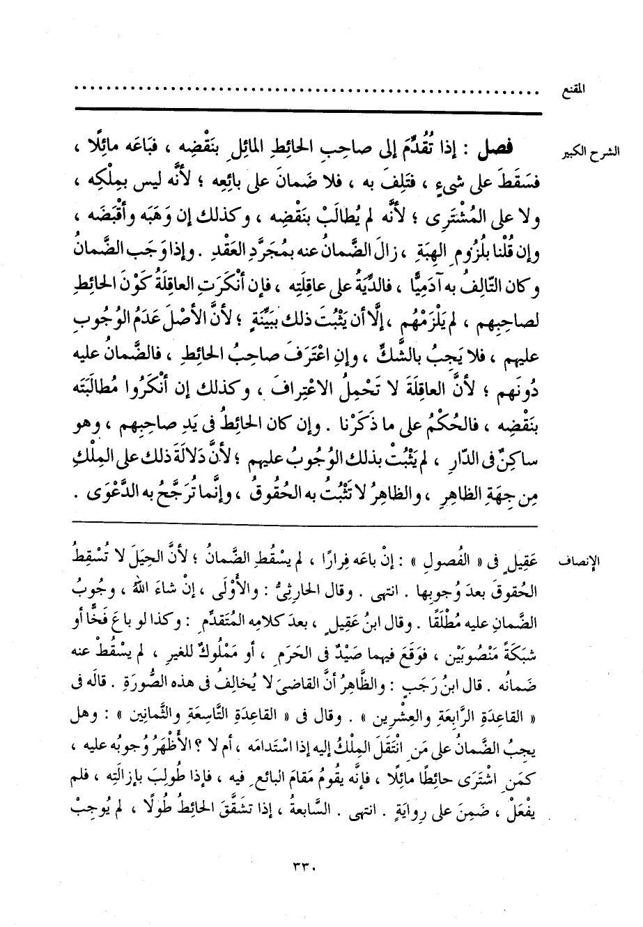 عَقِيلٍ في «الفُصولِ»: إنْ باعَه فِرارًا، لم يسْقُطِ الضَمانُ؛ لأنَّ الحِيَلَ لا تُسْقِطُ الحُقوقَ بعدَ وُجوبِها. انتهى. وقال الحارِثِيُّ: والأوْلَى، إنْ شاءَ الله، وجُوبُ الضَّمانِ عليه مُطْلَقًا. وقال ابنُ عَقِيلٍ، بعدَ كلامِه المُتَقدِّمِ: وكذا لو باعَ فَخًّا أو شبَكَةً مَنْصُوبَين، فوَقَعَ فيهما صَيدٌ في الحَرَمِ، أو مَمْلُوكٌ للغيرِ، لم يسْقُطْ عنه ضَمانُه. قال ابنُ رَجَبٍ: والظَّاهِرُ أنَّ القاضيَ لا يُخالِفُ في هذه الصُّورَةِ. قاله في «القاعِدَةِ الرَّابِعَةِ والعِشْرِين». وقال في «القاعِدَةِ التَّاسِعَةِ والثَّمانِين»: وهل يجِبُ الضَّمانُ على مَنِ انْتَقَلَ المِلْكُ إليه إذا اسْتَدامَه، أم لا؟ الأَظهَرُ وُجوبُه عليه، كمَنِ اشْتَرَى حائِطًا مائِلًا، فإنَّه يقُومُ مَقامَ البائعِ فيه، فإذا طُولِبَ بإزالتِه، فلم يفْعَلْ، ضَمِنَ على رِوايَةٍ. انتهى. السَّابعةُ، إذا تشَقَّقَ الحائِطُ طُولًا،، لم يُوجِبْ