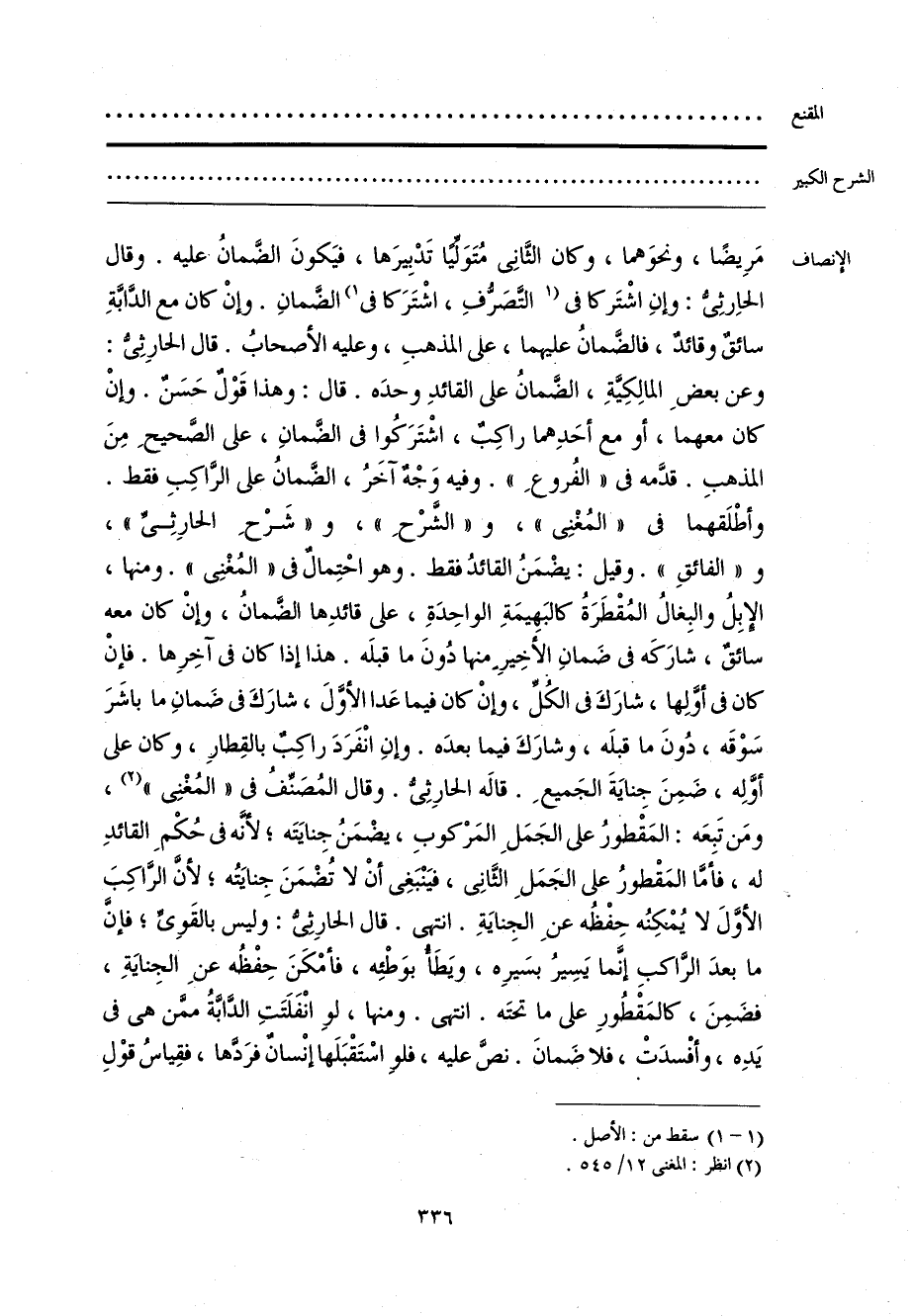مَرِيضًا، ونحوَهما، وكان الثَّانِي مُتَوَلِّيًا تَدْبِيرَها، فيَكونَ الضَّمانُ عليه. وقال الحارثِيُّ: وإنِ اشْتَركا في [التَّصَرُّفِ، اشْتَرَكا في] (¬1) الضَّمانِ. وإنْ كان مع الدَّابَّةِ سائق وقائدٌ، فالضَّمانُ عليهما، على المذهبِ، وعليه الأصحابُ. قال الحارِثِيُّ: وعن بعضِ المالِكِيَّةِ، الضَّمانُ على القائدِ وحدَه. قال: وهذا قَوْلٌ حَسَنٌ. وإنْ كان معهما، أو مع أحَدِهما راكِبٌ، اشْتَرَكُوا في الضَّمانِ، على الصَّحيحِ مِنَ المذهبِ. قدَّمه في «الفُروعِ». وفيه وَجْهٌ آخَرُ، الضَّمانُ على الراكِبِ فقط. وأطْلَقهما في «المُغْنِي»، و «الشَّرْحِ»، و «شَرْحِ الحارِثِيِّ»، و «الفائقِ». وقيل: يضْمَنُ القائدُ فقط. وهو احْتِمالٌ في «المُغْنِي». ومنها، الإبِلُ والبِغالُ المُقْطَرَةُ كالبَهِيمَةِ الواحِدَةِ، على قائدِها الضَّمانُ، وإنْ كان معه سائقٌ، شارَكَه في ضَمانِ الأخِير منها دُونَ ما قبلَه. هذا إذا كان في آخِرِها. فإنْ كان في أوَّلِها، شارَكَ في الكُلِّ، وإنْ كان فيما عَدا الأوَّلَ، شارَكَ في ضَمانِ ما باشَرَ سَوْقَه، دُونَ ما قبلَه، وشارَكَ فيما بعدَه. وإنِ انْفَرَدَ راكِبٌ بالقِطار، وكان على أوَّلِه، ضَمِنَ جِنايَةَ الجَميعِ. قاله الحارِثِيُّ. وقال المُصَنِّفُ في «المُغْنِي» (¬2)، ومَن تَبعَه: المَقْطورُ على الجَمَلِ المَرْكوبِ، يضْمَنُ جِنايَتَه؛ لانَّه في حُكْمِ القائدِ له، فأَمَّا المَقْطورُ على الجَمَلِ الثَّانِي، فيَنْبَغِي أنْ لا تُضْمَنَ جِنايَتُه؛ لأنَّ الرَّاكِبَ الأوَّلَ لا يُمْكِنُه حِفْظُه عنِ الجِنايَةِ. انتهى. قال الحارِثِيُّ: وليس بالقَويِّ؛ فإنَّ ما بعدَ الراكبِ إنَّما يَسِيرُ بسَيرِه، ويَطَأُ بوَطْئِه، فأمْكَنَ حِفْظُه عنِ الجِنايَةِ، فضَمِنَ، كالمَقْطُورِ على ما تحتَه. انتهى. ومنها، لو انْفَلَتَتِ الدَّابةُ ممَّن هي في يَدِه، وأفْسدَتْ، فلا ضمانَ. نصَّ عليه، فلو اسْتَقْبَلَها إنْسانٌ فرَدَّها، فقِياسُ قوْلِ