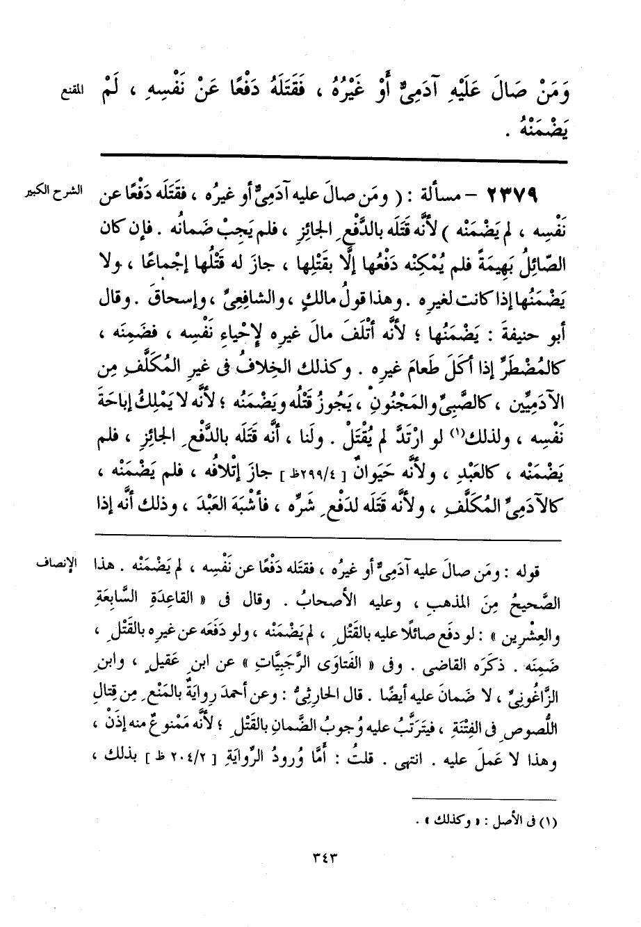 قوله: ومَن صال عليه آدَمِي أو غيرُه، فقتَله دَفْعًا عن نَفْسِه، لم يَضْمَنْه. هذا الصَّحيحُ مِنَ المذهبِ، وعليه الأصحابُ. وقال في «القاعِدَةِ السَّابِعَةِ والعِشْرِين»: لو دفَع صائلًا عليه بالقَتْلِ، لم يَضْمَنْه، ولو دَفَعَه عن غيرِه بالقَتْلِ، ضَمِنَه. ذكَرَه القاضي. وفي «الفَتاوَى الرَّجَبِيَّاتِ» عن ابن عَقيلٍ، وابنِ الرَّاغُونِيِّ، لا ضَمانَ عليه أيضًا. قال الحارِثِيُّ: وعن أحمدَ رِوايَةٌ بالمَنْعِ مِن قِتالِ اللصوصِ في الفِتْنَةِ، فيتَرتَّبُ عليه وُجوبُ الضَّمانِ بالقَتْلِ؛ لأنَّه مَمْنوعٌ منه إذَنْ، وهذا لا عَملَ عليه. انتهى. قلتُ: أمَّا وُرودُ الرِّوايَةِ بذلك،