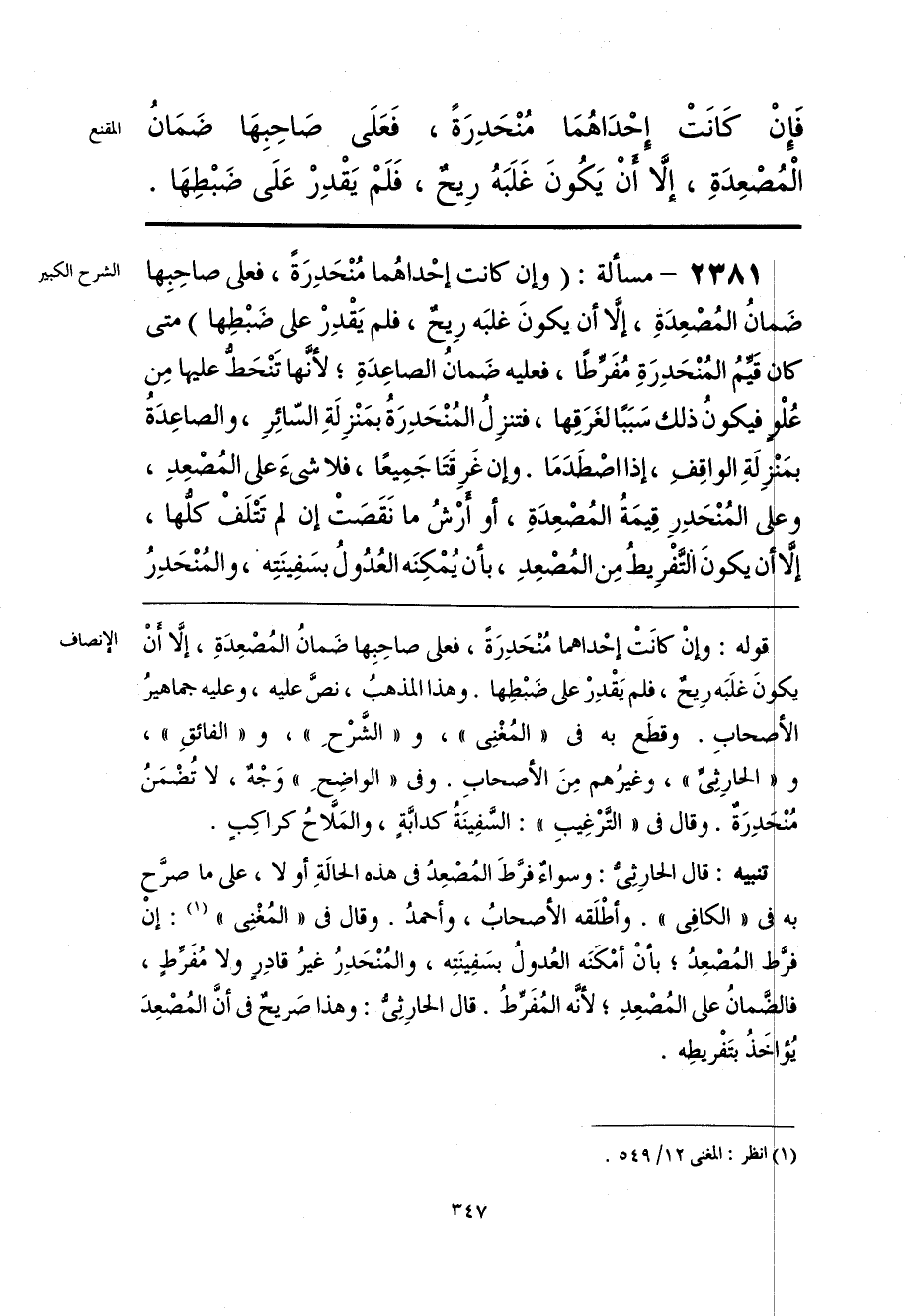 تنبيه: قال الحارِثِيُّ: وسواءٌ فرطَ المُصْعِدُ في هذه الحالةِ أو لا، على ما صرَّح به في «الكافِي». وأطْلَقه الأصحابُ، وأحمدُ. وقال في «المُغْنِي» (¬1): إن فرَّط المُصْعِدُ؛ بأنْ أمْكَنَه العُدولُ بسَفِينَتِه، والمُنْحَدِرُ غيرُ قادِرٍ ولا مُفَرِّطٍ، فالضَّمانُ على المُصْعِدِ؛ لأنَّه المُفَرِّطُ. قال الحارِثِيُّ: وهذا صَريحٌ في أنَّ المُصْعِدَ يُؤاخَذُ بتَفْريطِه.
