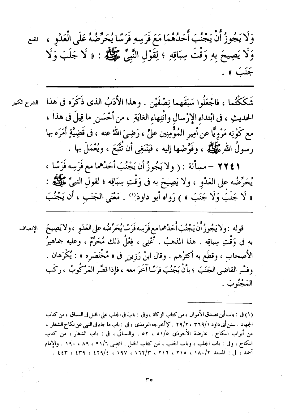 قوله: ولا يَجُوزُ أَنْ يَجْنُبَ أحَدُهما مع فَرَسِه فَرَسًا يُحَرِّضُه على العَدْو، ولا يَصِيحَ به في وَقْتِ سِباقِه. هذا المذهبُ. أعْنِي، فِعْلُ ذلك مُحَرَّمٌ، وعليه جماهيرُ الأصحابِ، وقطَع به أكثرُهم. وقال ابنُ رَزينٍ في «مُخْتَصَرِه»: يُكْرَهان. وفسَّر القاضي الجَنَبَ؛ بأنْ يَجْنُبَ فرَسًا آخَرَ مَعه، فإذا قصَّر المَرْكُوبُ، ركَب المَجْنُوبَ.