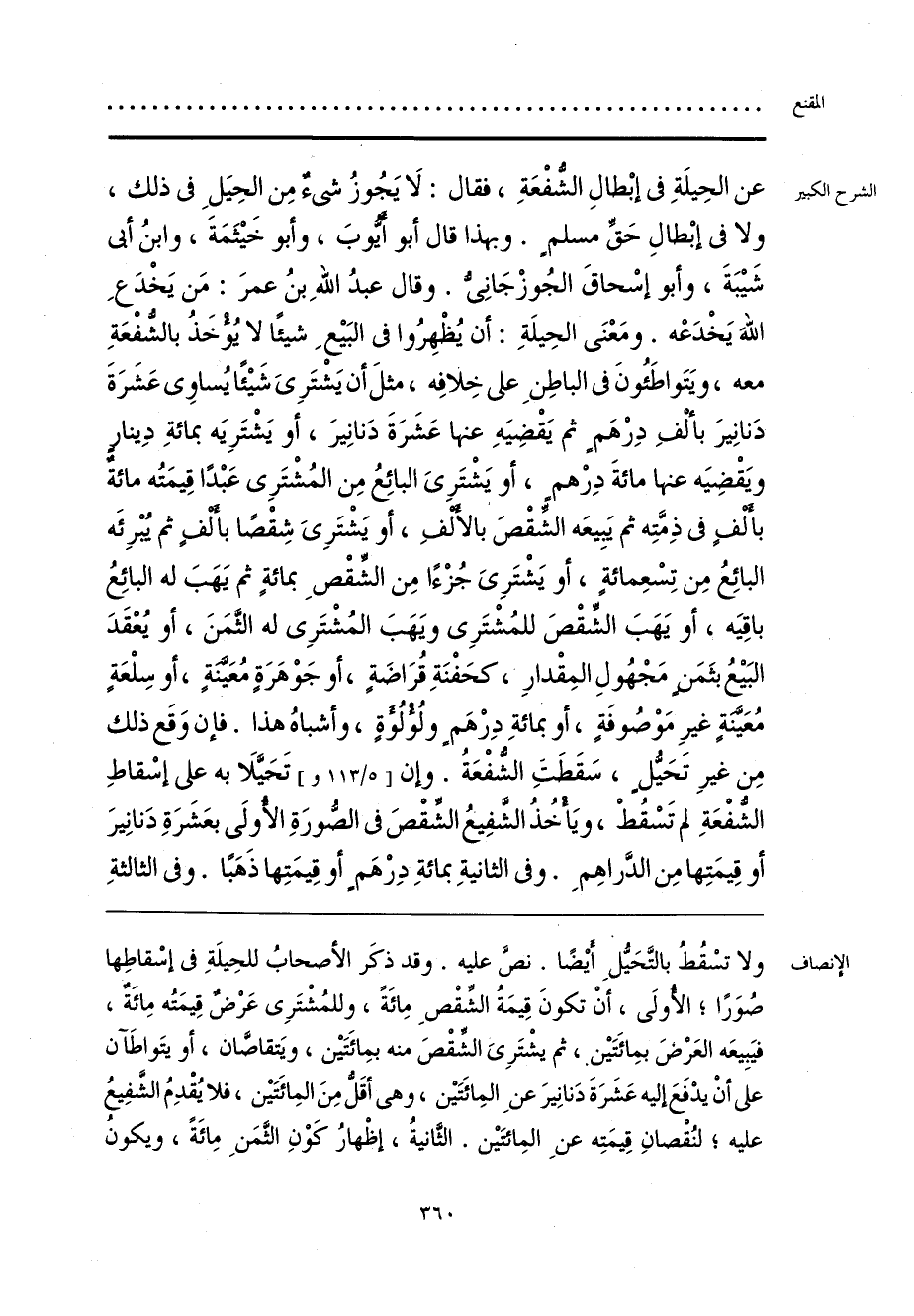 ولا تسْقُطُ بالتَّحَيُّلِ أَيضًا. نصَّ عليه. وقد ذكَر الأصحابُ للحِيلَةِ في إسْقاطِها صُوَرًا، الأُولَى، أنْ تكونَ قِيمَةُ الشِّقْصِ مِائَةً، وللمُشْتَرِي عَرْضٌ قِيمَتُه مِائَة، فيَبِيعَه العَرْضَ بمِائَتَين، ثم يشْتَرِيَ الشقْصَ منه بمِائَتَين، ويَتقاصَّان، أو يتَواطَآن على أنْ يدْفَعَ إليه عَشَرَةَ دَنانِيرَ عنِ المِائَتَين، وهي أقَلُّ مِنَ المِائَتَين، فلا يُقْدِمُ الشَّفِيعُ عليه؛ لنُقْصانِ قِيمَتِه عنِ المِائتَيْن. الثَّانيةُ، إظْهارُ كَوْنِ الثَّمَنِ مِائَةً، ويكون