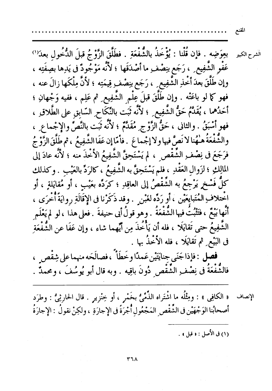 «الكافِي»: ومِثْلُه ما اشْتَراه الذميُّ بخَمْر، أو خِنْزِير. قال الحارِثِيُّ: وطرَد أصحابُنا الوَجْهَين في الشِّقْصِ المَجْعُولِ أُجْرَةً في الإجارَةِ، ولكِنْ نقولُ: الإِجارَةُ
