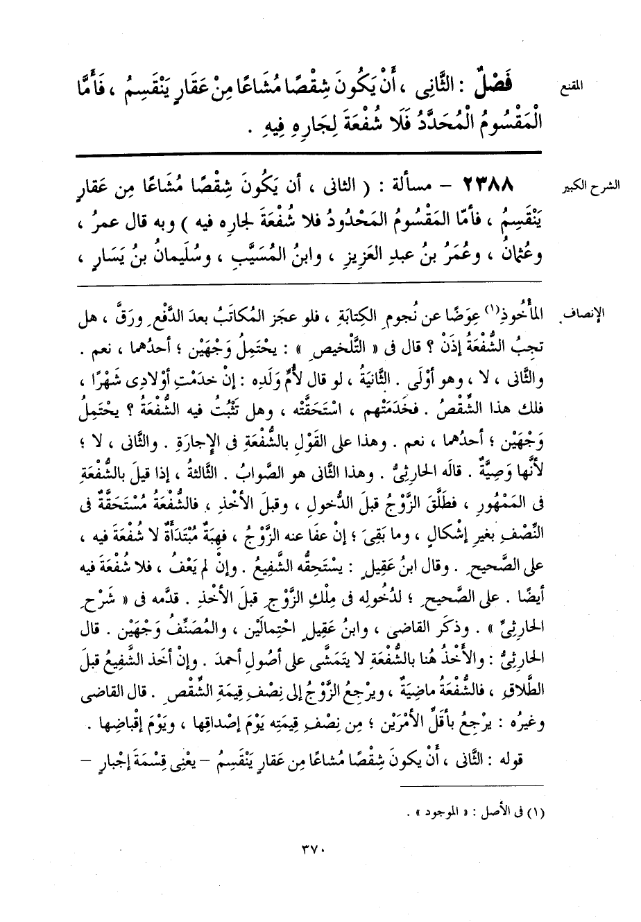 فَصْلٌ: الثَّانِي، أَنْ يَكُونَ شِقْصًا مُشَاعًا مِنْ عَقَارٍ يَنْقَسِمُ، فَأَما الْمَقْسُومُ الْمُحَادُ فَلَا شُفْعَةَ لِجَارِهِ فِيهِ.