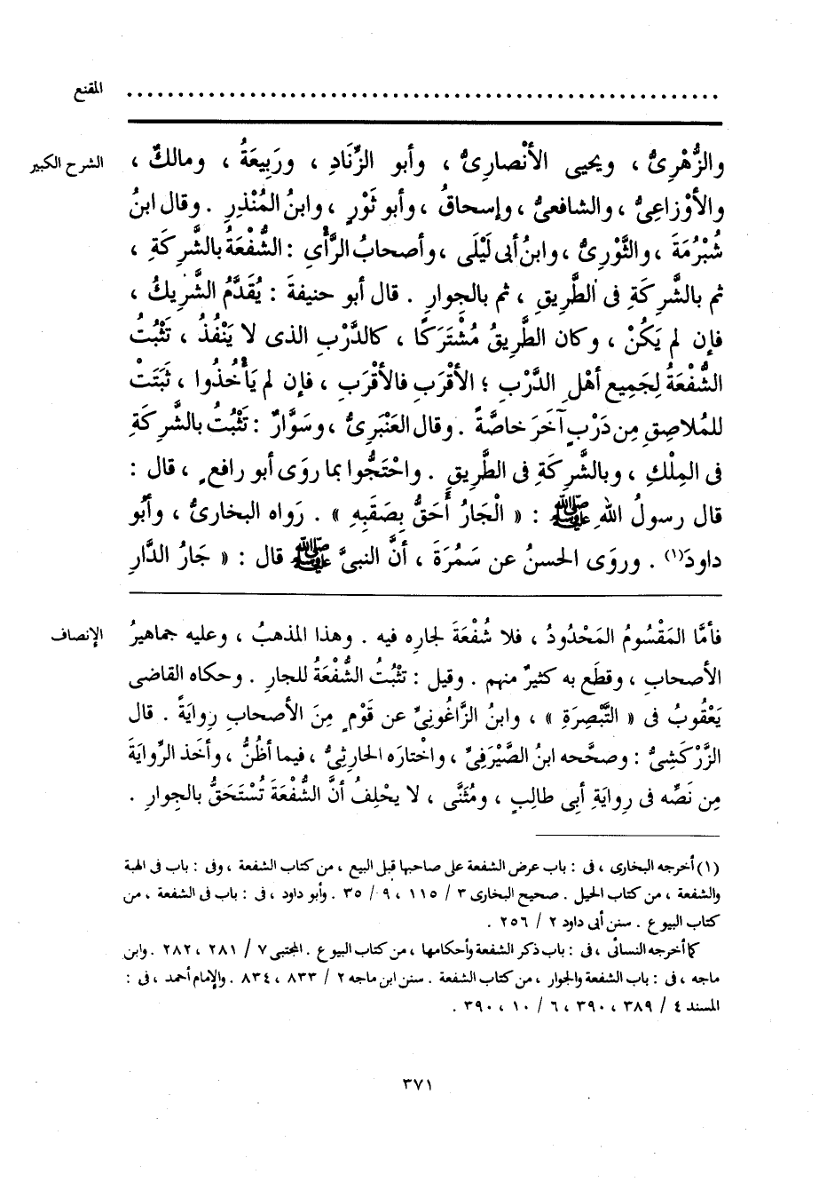 فأمَّا المَقْسُومُ المَحْدُودُ، فلا شُفْعَةَ لجارِه فيه. وهذا المذهبُ، وعليه جماهيرُ الأصحابِ، وقطَع به كثيرٌ منهم. وقيل: تثْبُتُ الشُّفْعَةُ للجارِ. وحكاه القاضي يَعْقُوبُ في «التَّبْصِرَةِ»، وابنُ الزَّاغُونِيِّ عن قَوْم مِنَ الأصحابِ رِوايَةً. قال الزَّرْكَشِيُّ: وصحَّحه ابنُ الصَّيرَفِيِّ، واخْتارَه الحارِثِيُّ، فيما أظُنُّ، وأخَذ الرِّوايَةَ مِن نَصِّه في رِوايَةِ أبِي طالِبٍ، ومُثَنَّى، لا يحْلِفُ أنَّ الشُّفْعَةَ تُسْتَحَقُّ بالجِوارِ.