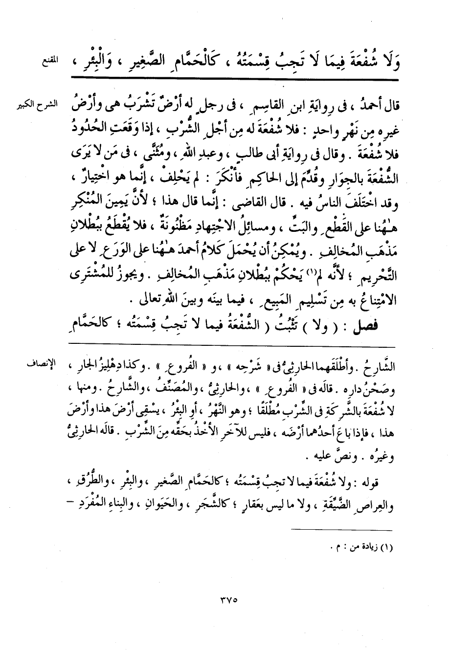 الشَّارِحُ. وأطْلَقَهما الحارِثِيُّ في «شَرْحِه»، و «الفُروعِ». وكذا دِهْلِيزُ الجارِ، وصَحْنُ دارِه. قاله في «الفُروعَ»، والحارِثِيُّ، والمُصَنِّفُ، والشَّارِحُ. ومنها، لا شُفْعَةَ بالشَّرِكَةِ في الشِّرْبِ مُطْلَقًا؛ وهو النَّهْرُ، أو البئْرُ، يسْقِي أرْضَ هذا وأرْضَ هذا، فإذا باعَ أحدُهما أرْضَه، فليس للآخَرِ الأخْذُ بحَقِّه مِنَ الشِّرْبِ. قاله الحارِثِيُّ وغيرُه. ونصَّ عليه.