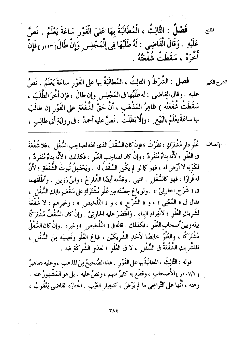فصلٌ: الثَّالِثُ، الْمُطَالبَةُ بِهَا عَلى الْفَوْرِ سَاعَةَ يَعْلَمُ. نَصَّ عَلَيهِ. وَقَال الْقَاضِي: لَهُ طَلبُهَا فِي الْمَجْلِسِ وَإنْ طَال فَإنْ أخَّرَهُ، سَقَطَتْ شُفعَتُهُ.