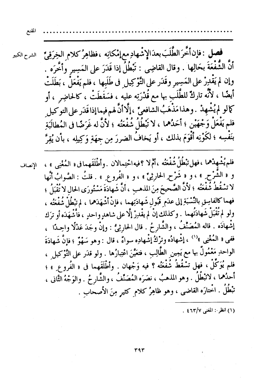 فلم يُشْهِدْهما، فهل تبْطُلُ شُفْعَتُه، أمُّ لا؟ فيه احْتِمالان. وأطْلَقَهما في «المُغْنِي»، و «الشَّرْحِ»، و «شَرْحِ الحارِثِيِّ»، و «الفُروعِ». قلتُ: الصَّوابُ أنَّها لا تسْقُطُ شُفْعَتُه؛ لأنَّ الصَّحيحَ مِنَ المذهبِ، أنَّ شَهادَةَ مَسْتُورَى الحالِ لا تُقْبَلُ؛ فهما كالفاسِقِ بالنِّسْبَةِ إلى عدَمِ قَبُولِ شَهادَتِهما، فإنْ أشْهَدَهما، لم تبْطُلْ شُفْعَتُه، ولو لم تُقْبَلْ شَهادَتُهما. وكذلك إنْ لم يقْدِرْ إلَّا على شاهدٍ واحدٍ، فأَشْهَدَه أو ترَك إشْهادَه. قاله المُصَنِّفُ، والشَّارِحُ. قال الحارِثِيُّ: وإنْ وجَدَ عَدْلًا واحِدًا، ففي «المُغنِي» (¬1)، إشْهادُه وترْكُ إشْهادِه سواءٌ، قال: وهو سَهْوٌ، فإنَّ شَهادَةَ الواحدِ مَعْمُولٌ بها مع يَمِينِ الطَّالِبِ، فتعَيَّنَ اعْتِبارُها. ولو قدَر على التَّوْكيلِ، فلم يُوَكِّلْ، فهل تسْقُطُ شُفْعَتُه؟ فيه وَجْهان. وأطْلَقَهما في «الفُروعِ»؛ أحدُهما، لا تبْطُلُ. وهو المذهبُ، نصَرَه المُصَنِّفُ، والشَّارِحُ. والوَجْهُ الثَّاني، تبْطُلُ. اخْتارَه القاضي، وهو ظاهِرُ كلامِ كثيرٍ مِنَ الأصحابِ.