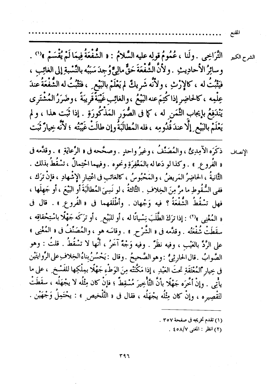 ذكَرَه الآمِدِيُّ، والمُصَنِّفُ، وغيرُ واحدٍ. وصحَّحه في «الرِّعايَةِ». وقدَّمه في «الفُروعِ». وكذا لو دَعا له بالمَغْفِرَةِ ونحوه. وفيهما احْتِمالٌ، تسْقُطُ بذلك. الثَّانيةُ، الحاضِرُ المَريضُ، والمَحْبُوسُ، كالغائبِ في اعْتِبارِ الإِشْهادِ، فإنْ ترَك، ففي السُّقُوطِ ما مرَّ مِنَ الخِلافِ. الثَّالثةُ، لو نَسِيَ المُطالبَةَ أو البَيعَ، أو جَهِلَها، فهل تسْقُطُ الشُّفْعَةُ؟ فيه وَجْهان. وأطْلَقهما في «الفُروعِ». قال في «المُغْنِي» (¬1): إذا ترَكَ الطَّلَبَ نِسْيانًا له، أو للبَيعِ، أو ترَكَه جَهْلًا باسْتِحْقاقِه، سقَطَتْ شُفْعَتُه. وقدَّمه في «الشَّرْحِ». وقاسَه هو، والمُصَنِّفُ في «المُغْنِي» على الرَّدِّ بالعَيبِ، وفيه نظَرٌ. وفيه وَجْهٌ آخَرُ، أنَّها لا تسْقُطُ. قلتُ: وهو الصَّوابُ. قال الحارِثِيُّ: وهو الصَّحيحُ. وقال: يَحْسُنُ بِناءُ الخِلافِ على الرِّوايتَين في خِيارِ المُعْتَقَةِ تحتَ العَبْدِ، إذا مَكَّنَتْه مِنَ الوَطْءِ جَهْلًا بمِلْكِها للفَسْخِ، على ما يأْتِي. وإنْ أخَّرَه جَهْلًا بأنَّ التَّأْخِيرَ مُسْقِطٌ؛ فإنْ كان مِثْلُه لا يجْهَلُه، سقَطَتْ لتَقْصِيرِه، وإنْ كان مِثْلُه يجْهَلُه، فقال في «التَّلْخيصِ»: يحْتَمِلُ وَجْهَين.